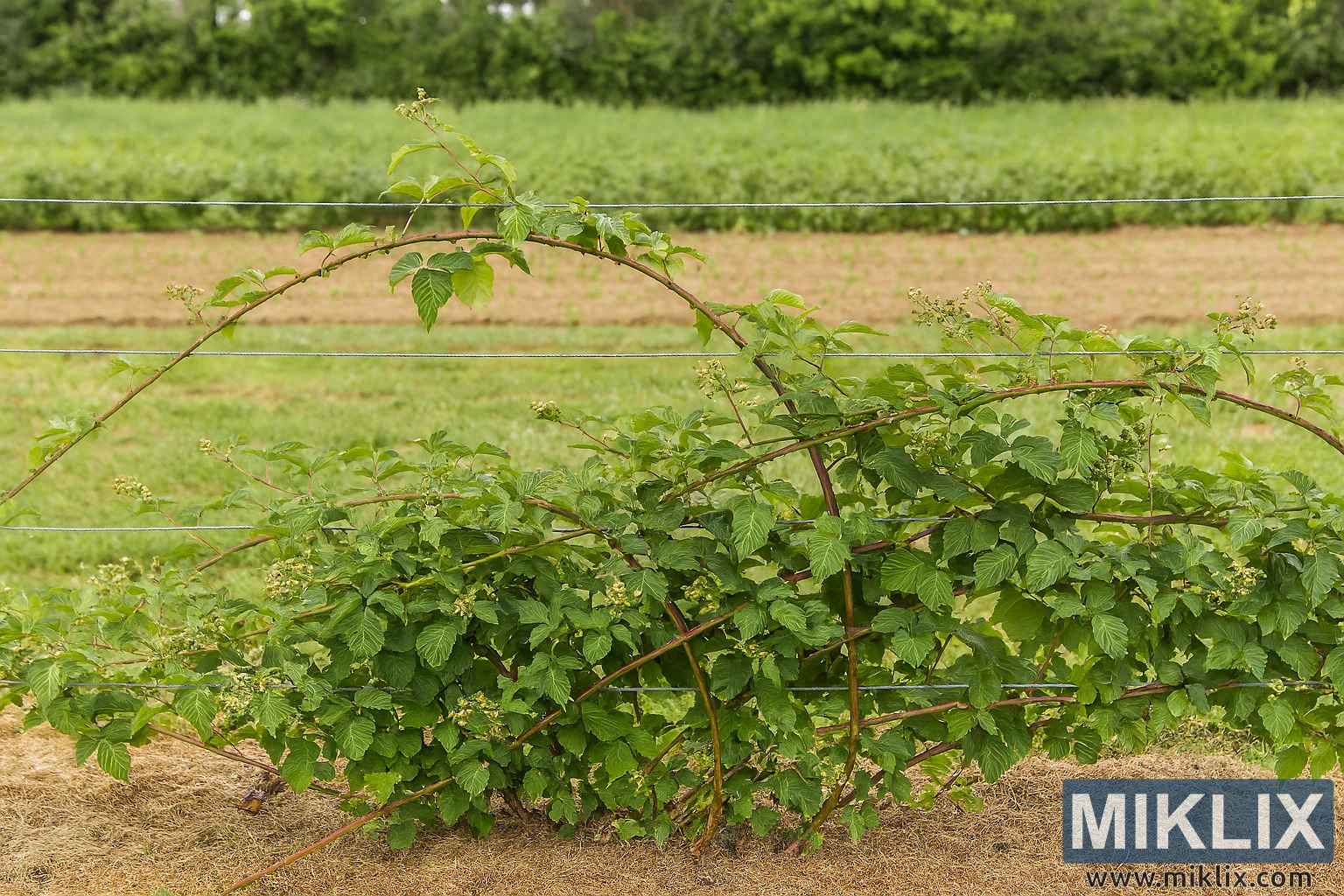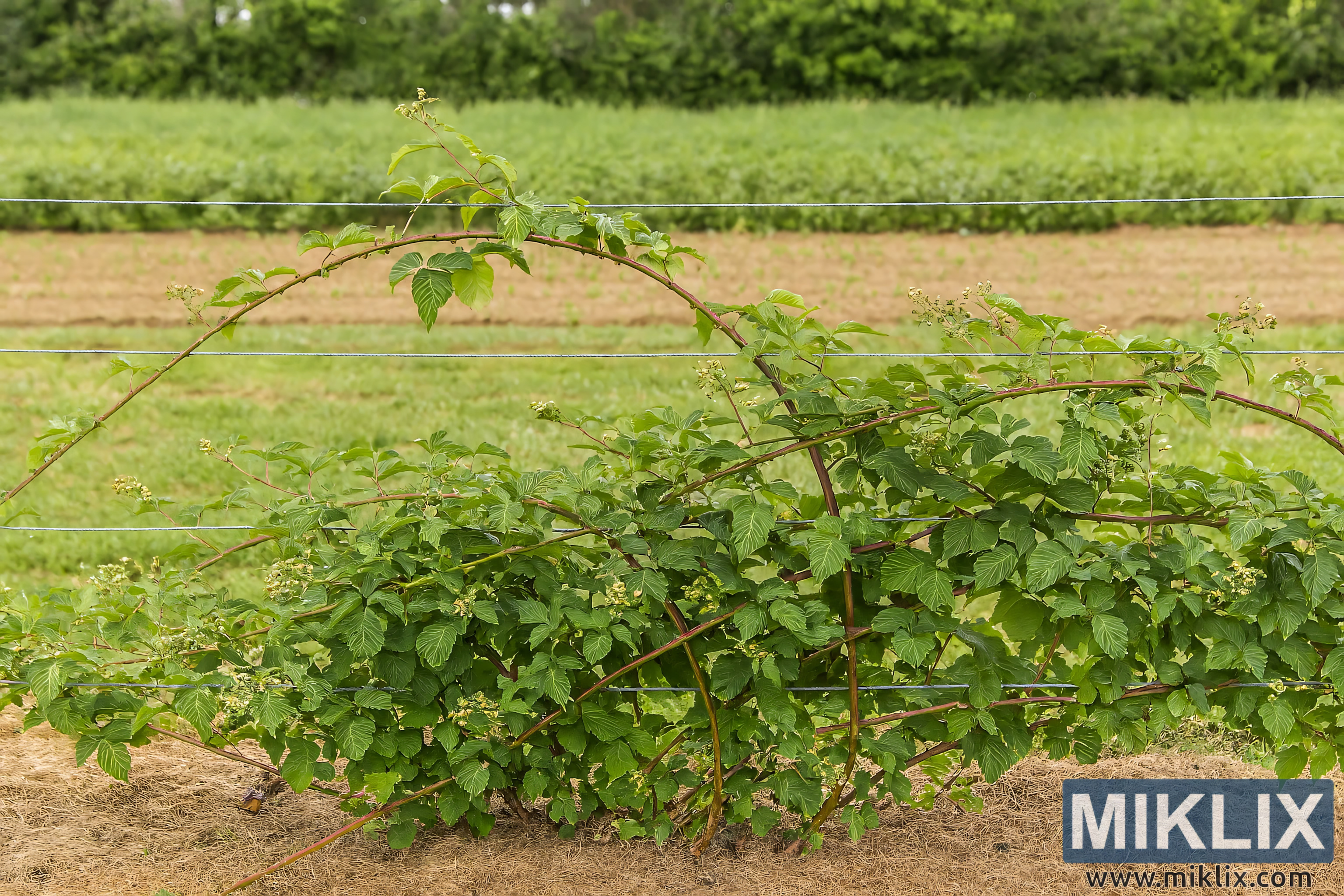 Půda pod rostlinou je pokryta slámově zbarveným mulčem, který pomáhá zadržovat vlhkost a potlačovat plevel. Tento mulč kontrastuje s pestrou zelení nad ní a vytváří vizuálně přitažlivou základní vrstvu. V pozadí se zahrada rozprostírá do jemně zaostřené venkovské krajiny. Řady obdělávané půdy a nízko rostoucích plodin se táhnou až k vzdálené linii lesa složené ze smíšených listnatých a stálezelených druhů. Stromy tvoří přirozený okraj, jejichž listy se pohybují od tmavě smaragdových po světlejší limetkové tóny, což dodává scéně hloubku a texturu.