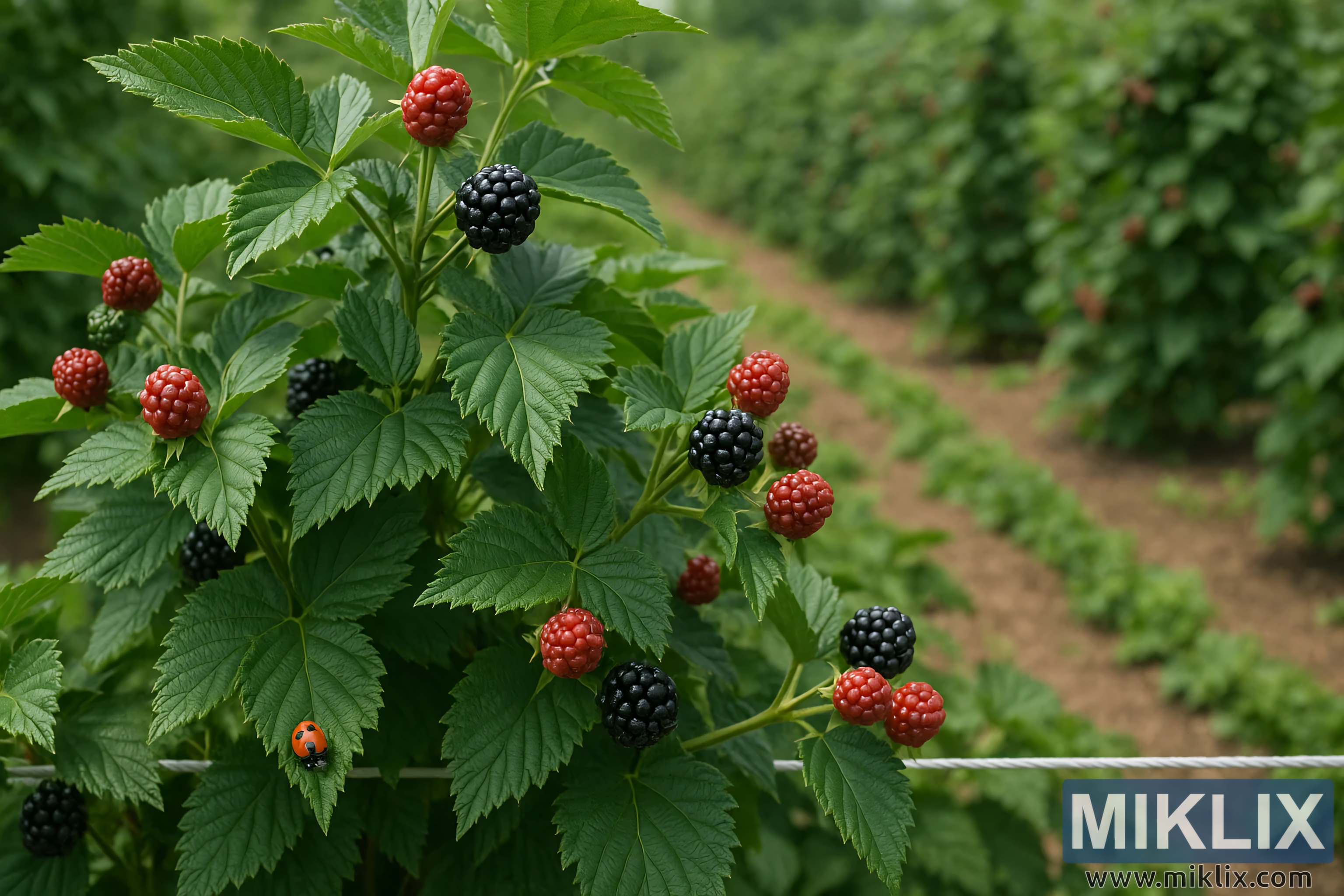 Tato krajinářská fotografie s vysokým rozlišením zachycuje prosperující plantáž ostružin, která je příkladem výhod integrované ochrany proti škůdcům (IPM). V popředí dominuje záběru statná rostlina ostružiny, jejíž stvoly jsou obsypané hrozny bobulí v různých fázích zralosti. Kompozice zdůrazňuje přirozený vývoj od pevných, nezralých zelených a červených bobulí k plně zralým, lesklým černým plodům připraveným ke sklizni. Kontrast mezi tmavě zbarvenými, lesklými ostružinami a zářivě červenými nezralými plody poskytuje výrazný vizuální signál hojnosti a vitality.