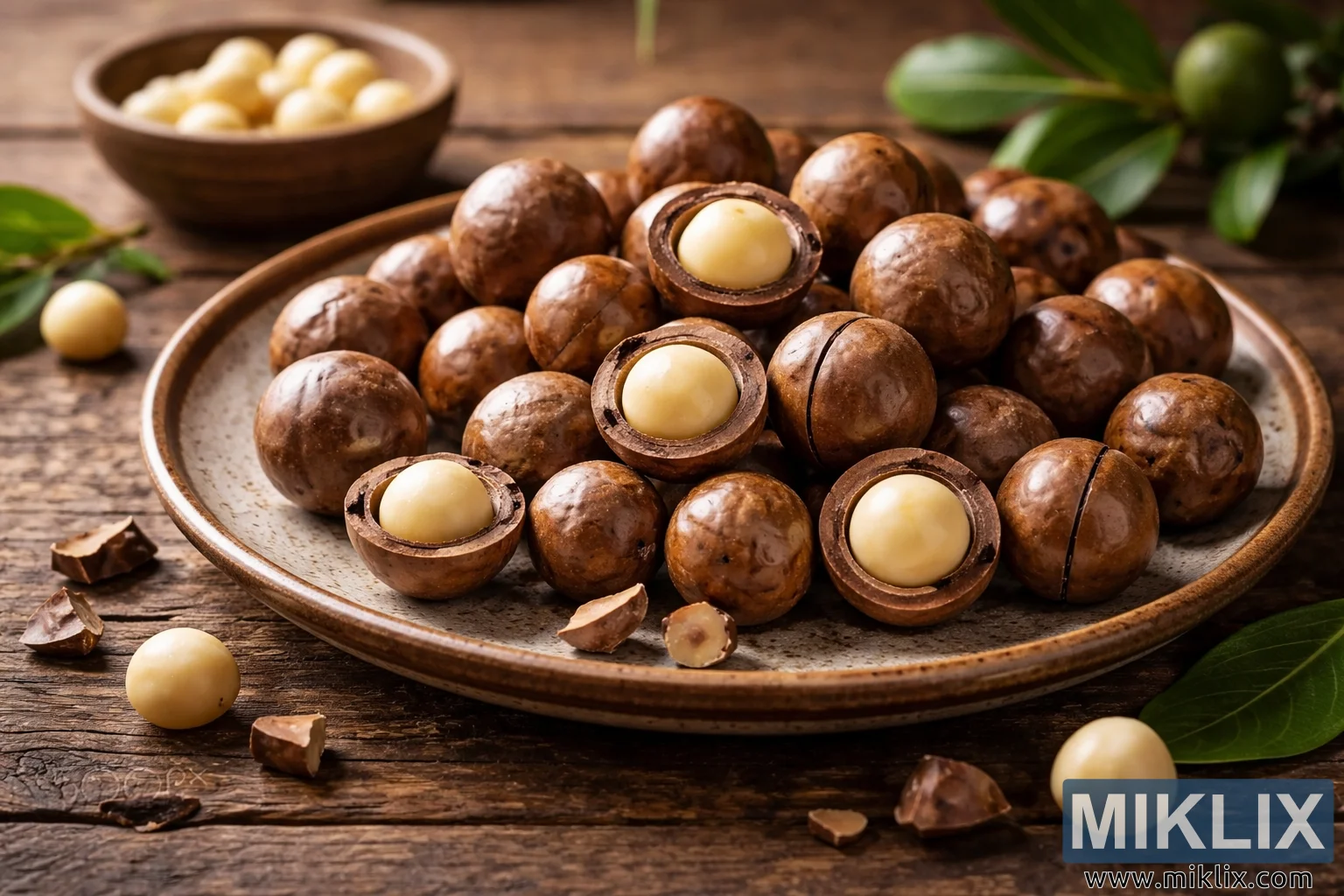 V jemně zaostřeném pozadí dodává scéně hloubku a kontext malá dřevěná miska naplněná loupanými makadamovými ořechy. Teplé tóny misky odrážejí odstíny stolu a mušlí a vytvářejí soudržnou, přirozenou barevnou paletu, v níž dominují hnědé, krémové a tlumené zelené odstíny. Čerstvé zelené listy, pravděpodobně z rostliny makadamových ořechů, jsou částečně viditelné v blízkosti misky a vnášejí jemný náznak svěžesti a původu, aniž by odváděly pozornost od hlavního objektu.