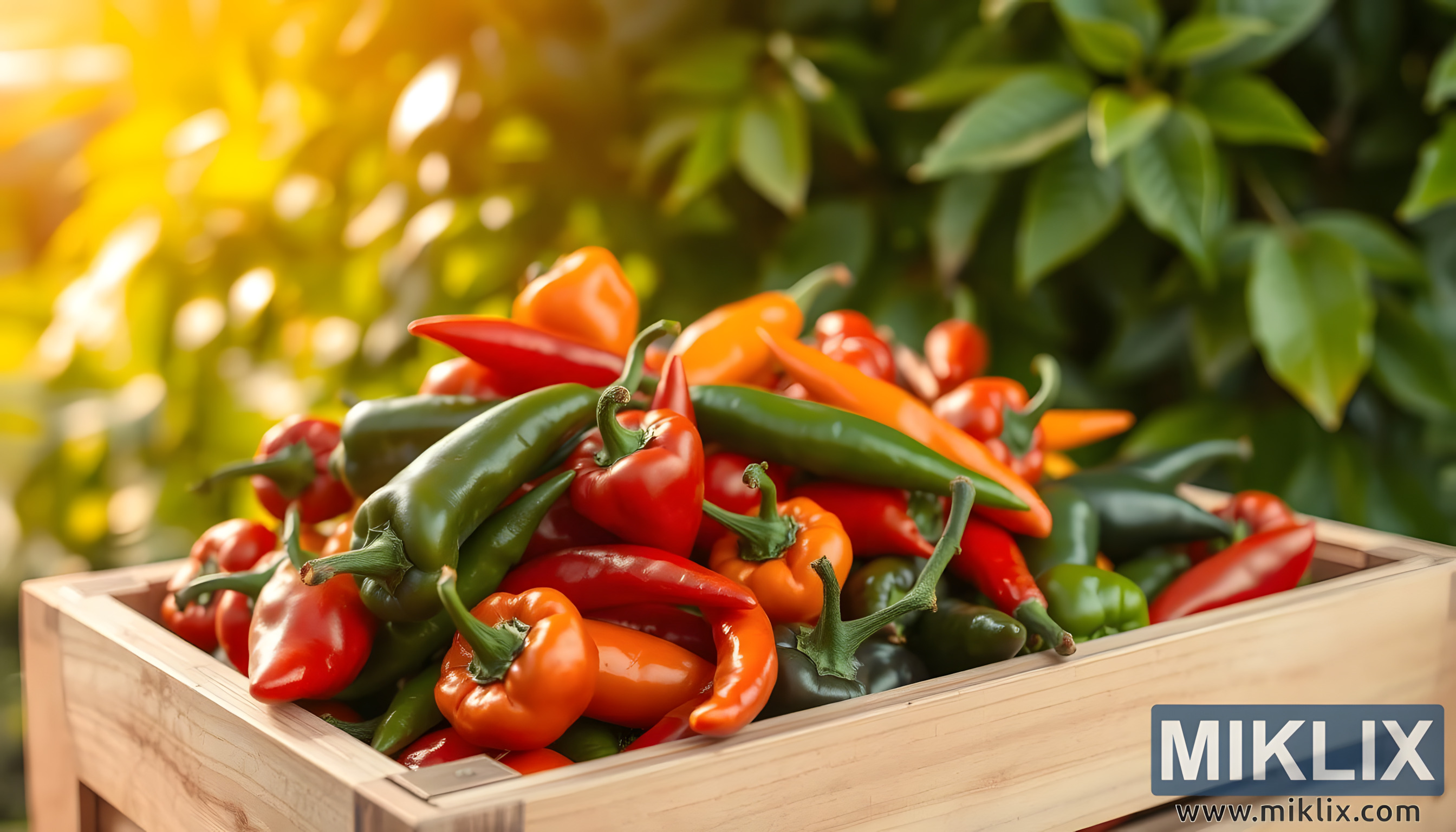 Pozadí, jemně rozmazané zeleným listovím, hraje v této kompozici klíčovou roli. Listy a zeleň vytvářejí klidný, ale zároveň úrodný kontext a posilují myšlenku, že tyto papriky nejsou jen komoditou, ale darem půdy, živenou slunečním světlem, deštěm a pečlivým pěstováním. Rozptýlené světlo pronikající skrz listí vrhá na scénu zlatou záři a dodává paprikám zářivou vitalitu. Tato souhra světla a stínu zdůrazňuje lesklý povrch jejich slupek, díky čemuž vypadají téměř jako drahokamy, jako by to byly vzácné poklady ukryté v dřevěném rámu.