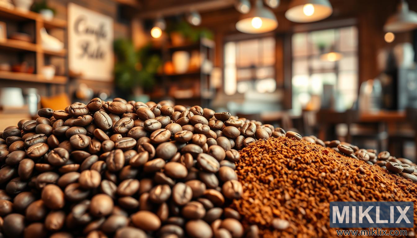 Vysoce rozlišený obrázek celých i mletých kávových zrn v zemitých tónech na rozmazaném rustikálním kavárenském pozadí evokujícím teplo a pohodu.