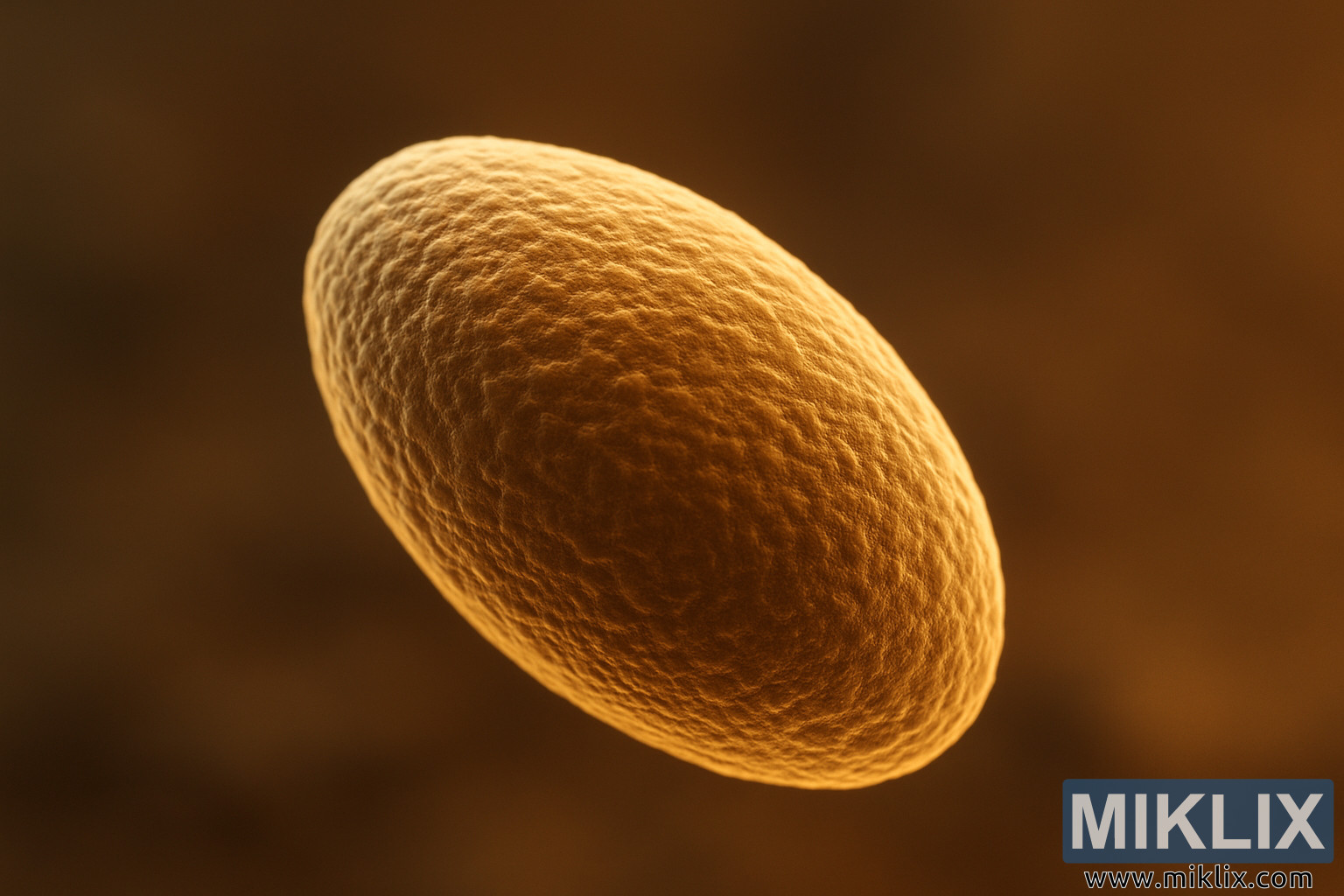 Billedet præsenterer et slående og videnskabeligt stemningsfuldt nærbillede af en tysk lagergærcelle, taget under høj forstørrelse for at afsløre de indviklede detaljer i dens struktur. Sideprofilen fremhæver cellens karakteristiske elliptiske form med let tilspidsede ender, der adskiller den fra andre mikroorganismer. Dens overfladetekstur, oplyst af blødt, varmt lys, virker næsten taktil – dækket af subtile riller, bølger og smilehuller, der antyder både kompleksiteten af gærens cellevæg og de biologiske processer, der finder sted indeni. Lysdesignet er særligt effektivt og bader cellen i en gylden glød, der fremhæver hver kontur, samtidig med at den skaber en naturlig dybdefølelse. Skygger spiller blødt hen over den teksturerede overflade og forstærker det tredimensionelle indtryk af det mikroskopiske motiv.