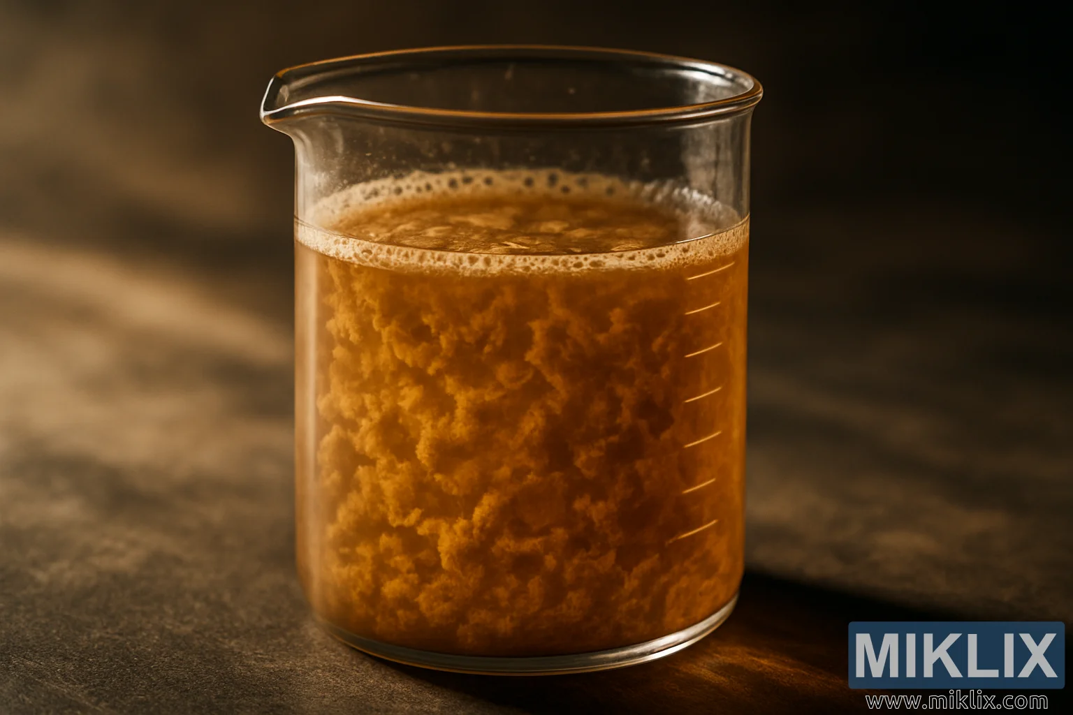 Højopløsningsfoto af flokkulerende ølgær i et bægerglas med varmt sidelys, der fremhæver opslæmmede klynger under gæringen.