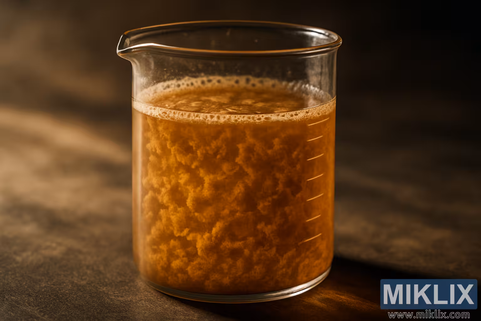 Dette landskabsfotografi i høj opløsning giver et stemningsfuldt og videnskabeligt engagerende billede af flokkuleringsprocessen i ølgær, fanget under en kritisk fase af gæringen. I midten af billedet, der optager en stor del af forgrunden, står et klart laboratorieglasbægerglas, cylindrisk i form, fyldt næsten til randen med en uklar, gyldenbrun væske. Beholderen er placeret på en mørk, diskret tekstureret overflade, der står i stærk kontrast til bægerglassets indhold, hvilket forbedrer den visuelle klarhed og dybde.