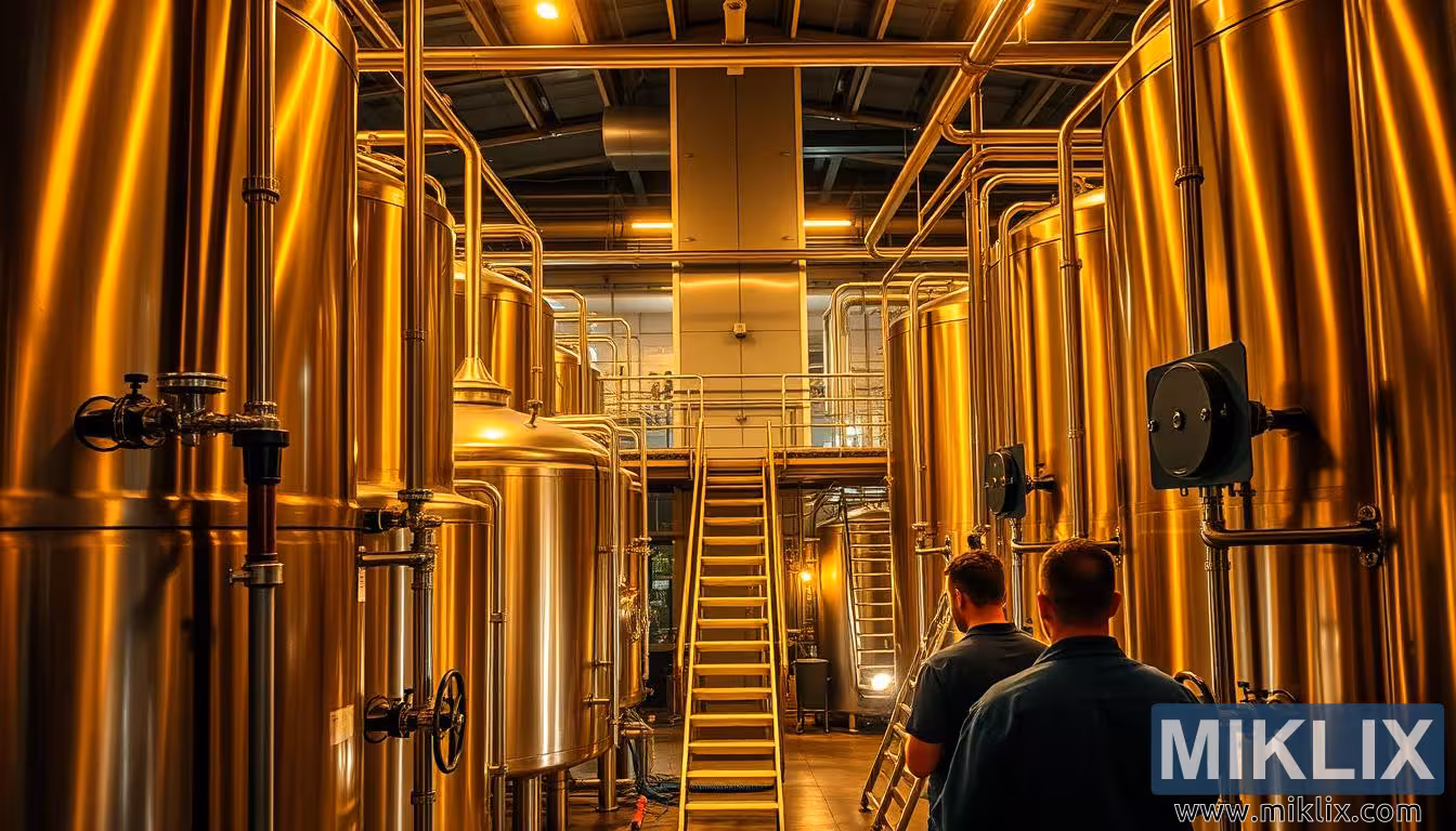 Et moderne bryggeri viser arbejdere, der overvåger gæringen i skinnende ståltanke, hvilket fremhæver præcision, effektivitet og professionel ølfremstilling.