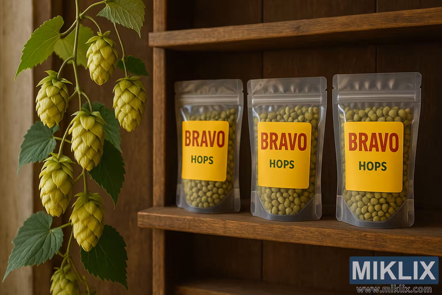 Hver pose har en fed, rektangulær etiket fastgjort på forsiden. Etiketterne er rene, enkle og iøjnefaldende i deres design. De har en lys gul baggrund, der står tydeligt i kontrast til det mørkere træ bagved og de mere dæmpede grønne toner fra humlepillerne indeni. Øverst på hver etiket er ordet "BRAVO" trykt med store, blokerede bogstaver i en dyb rød farve. Nedenunder vises ordet "HOPS" med en lidt mindre, fed, mørkegrøn skrifttype. Denne klare og minimalistiske mærkning fremhæver produktnavnet, samtidig med at den bevarer en håndværksmæssig æstetik for små partier. Den nederste del af etiketterne er overskuelig uden overflødig tekst eller grafik, hvilket sikrer, at brandingen forbliver skarp, læselig og elegant.