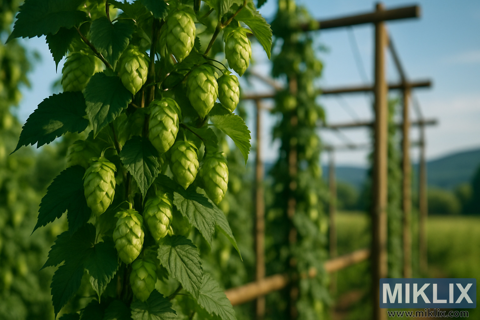 Et detaljeret, solbeskinnet billede af Feux-Coeur-humlekogler, der vokser på et træespalier, mod bølgende bakker og en rolig, landlig baggrund.