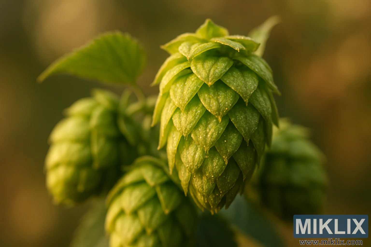 De omgivende kogler, en smule slørede, men stadig tydelige, giver en følelse af dybde og overflod, hvilket forstærker indtrykket af, at denne klynge er en del af en meget større, blomstrende humleplante. Deres tilstedeværelse skaber en visuel rytme, en naturlig gentagelse, der fremkalder de store humlemarker, der dyrkes hvert år ved høsttid. Et enkelt blad titter ind i billedet, dets årer fanger lige nok lys til at minde beskueren om den levende plante, der nærer disse kogler. Denne organiske detalje tilføjer kontekst, forbinder koglerne med den større landbrugsproces og antyder forbindelsen mellem landbrug og brygning.