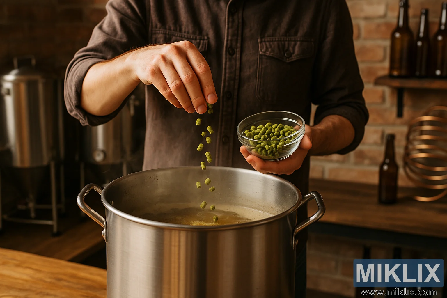 centrum af handlingen strækker en hjemmebryggers arm sig ind i billedet, klædt i en tekstureret, brun flannelskjorte rullet op i ærmerne – en anerkendelse af både det praktiske og den rustikke, praktiske natur ved småskalabrygning. I den ene hånd holder bryggeren en lille, klar glasskål fyldt med livlige grønne humlepiller. I den anden drysser bryggeren forsigtigt humlen ned i kedlen, en kaskade af grønne piller fanget midt i luften, mens de falder ned mod den kogende urt. Øjeblikket illustrerer ikke kun den taktile tilfredsstillelse ved brygning, men også den præcision og omhu, der er involveret i at balancere smagsoplevelser gennem humletilsætninger. Hver humlepil repræsenterer et koncentreret udbrud af aroma og bitterhed, hvilket er afgørende for at forme øllets endelige karakter.