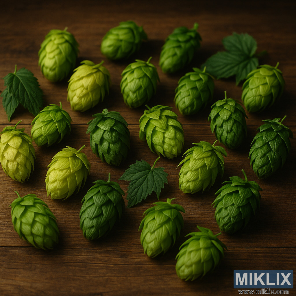 Spredt ud over bordet ligger adskillige friskhøstede humlekogler, hver især unikke i størrelse, form og farvetone. Deres farve spænder fra bleg, næsten limegrøn i den lysere ende af spektret, til dyb, mættet skovgrøn. Denne variation understreger ikke kun individualiteten af hver humlesort, men afspejler også mangfoldigheden af aromaer, bitterhedsniveauer og smagsprofiler, som bryggere kan udforske, når de erstatter Tahoma.
