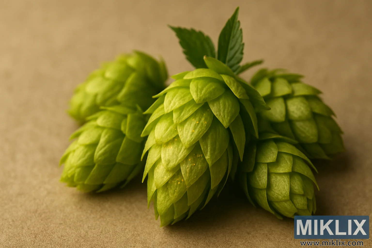 Et nærbillede af livlige Tahoma-humlekogler, deres lagdelte højblade og gyldne lupulinkirtler fremhævet under varmt lys mod en neutral baggrund.
