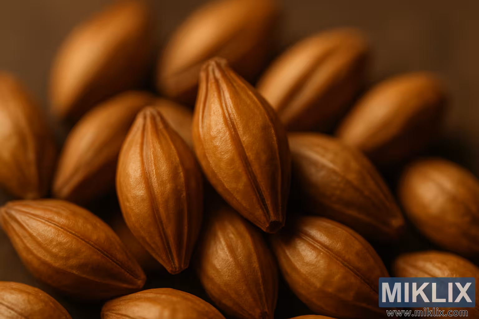 Kornene er fanget i skarpt fokus, hvilket giver beskueren mulighed for at værdsætte de subtile variationer i form og overfladedetaljer. Nogle kerner fremstår let rynkede, et karakteristisk kendetegn ved Maris Otters unikke struktur, mens andre er glattere med fine linjer ætset langs deres længde. Denne visuelle kompleksitet afspejler maltens smagsprofil - rig, kikset og nøddeagtig, med en fylde, der har gjort den til en fast bestanddel af engelske ales i årtier. Billedet viser ikke kun malt; det inviterer beskueren til at føle den, at forestille sig vægten af en håndfuld, lyden af den, der hældes i en mølle, aromaen, der frigives, når den moses og trækkes.