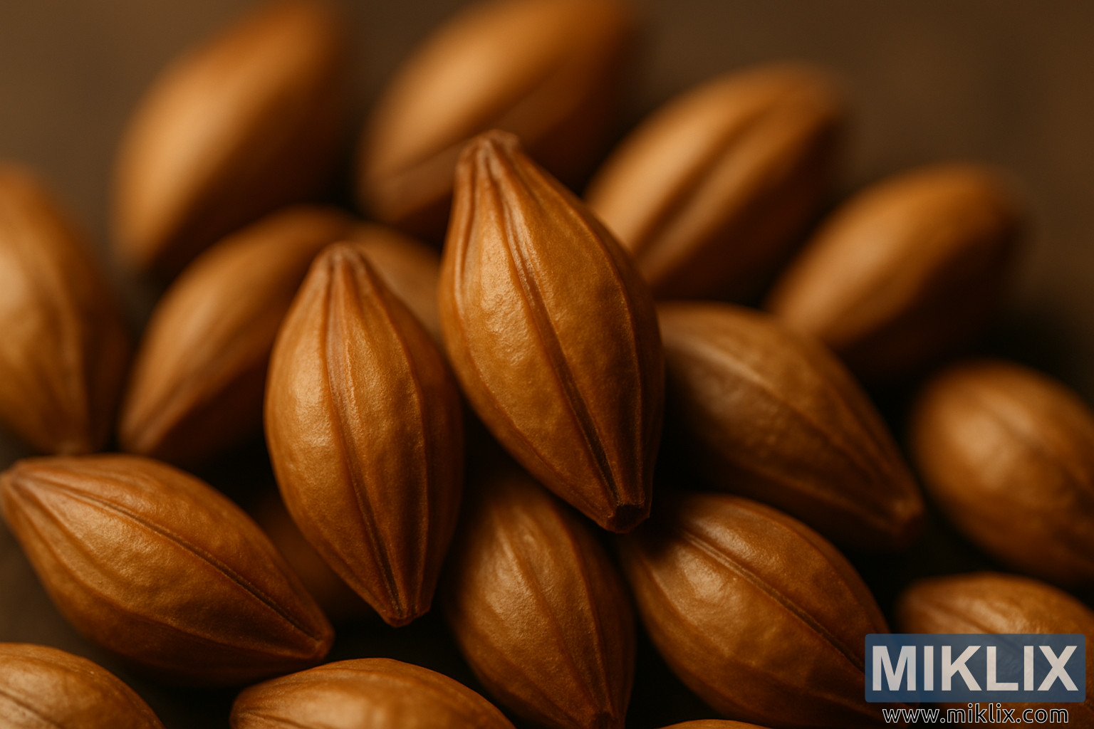 dette rigt detaljerede nærbillede tilbyder billedet en taktil og visuel hyldest til en af de mest ærede malte i traditionel britisk brygning - Maris Otter. Forgrunden domineres af en tæt arrangeret klynge af maltkorn, hver aflang og symmetrisk, med en central ryg, der løber på langs, og som giver kernerne deres karakteristiske tekstur. Belysningen er blød, men retningsbestemt og kaster blide skygger, der fremhæver kornenes konturer og striber. Deres overflader glimter svagt med en karamelfarve, der spænder fra varme gyldenbrune farver til dybere ravfarvede toner, hvilket antyder den dybde af smag, de bærer indeni.