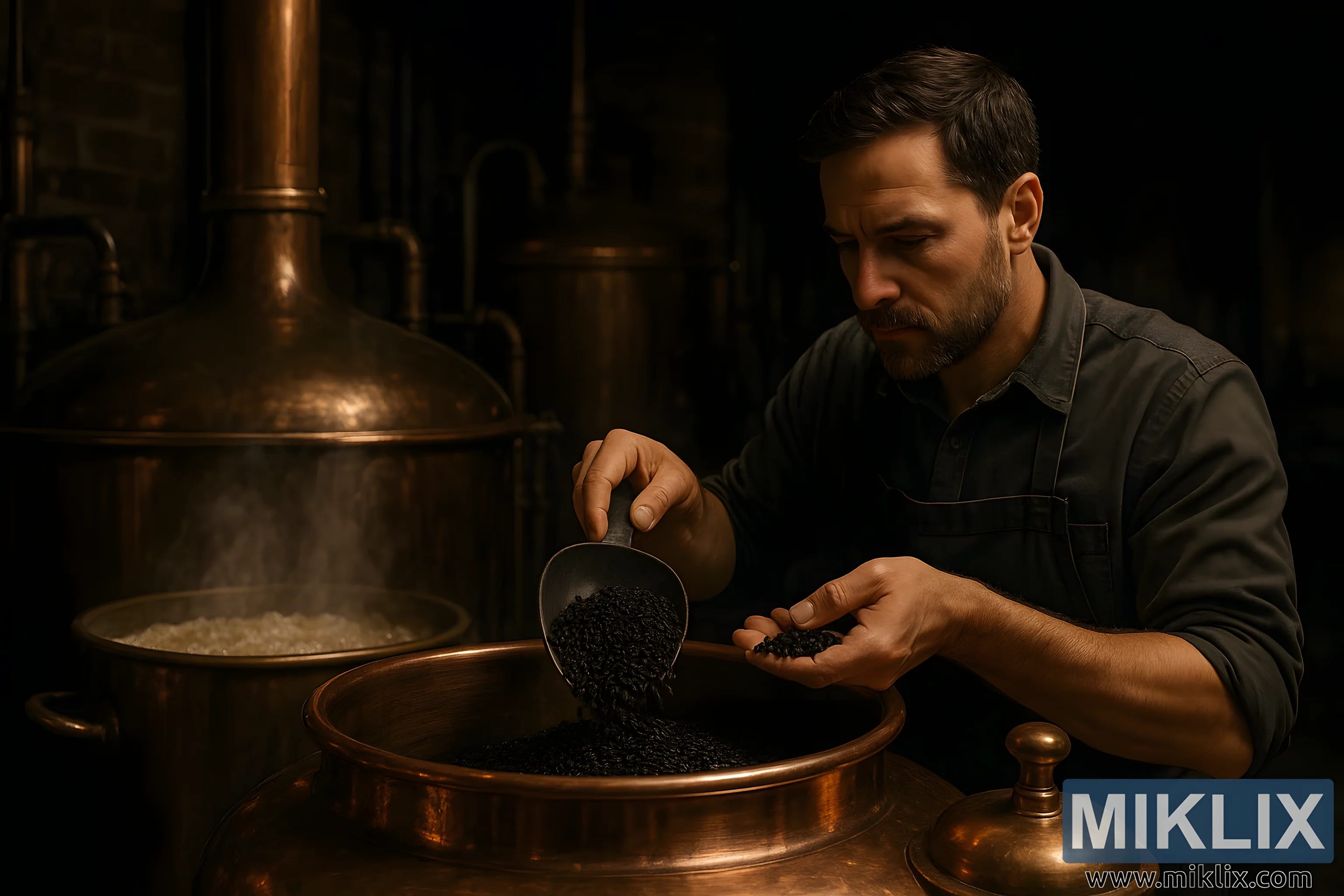 hjertet af et bryghus, der er gennemsyret af varme og tradition, indfanger billedet et øjeblik med stille intensitet og fokuseret håndværk. Belysningen er lav og gylden, kaster et blødt skær hen over kobberoverfladerne og indhyller rummet i en trøstende dis. I forgrunden står en brygger balanceret over en skinnende kobberkedel, hans stilling er bevidst og hans blik er rettet mod den forestående opgave. Han holder en skefuld fyldt med midnatsmalt af hvede – korn så mørke, at de synes at absorbere lyset omkring dem, deres blanke overflader fanger subtile højdepunkter, der afslører deres rige, ristede karakter. Når han hælder kornene i kedlen, kaskaderer de i en langsom, jordagtig strøm og frigiver en svag aroma, der antyder de kommende smagsnuancer: noter af kakao, ristet brød og en hvisken af røg.
