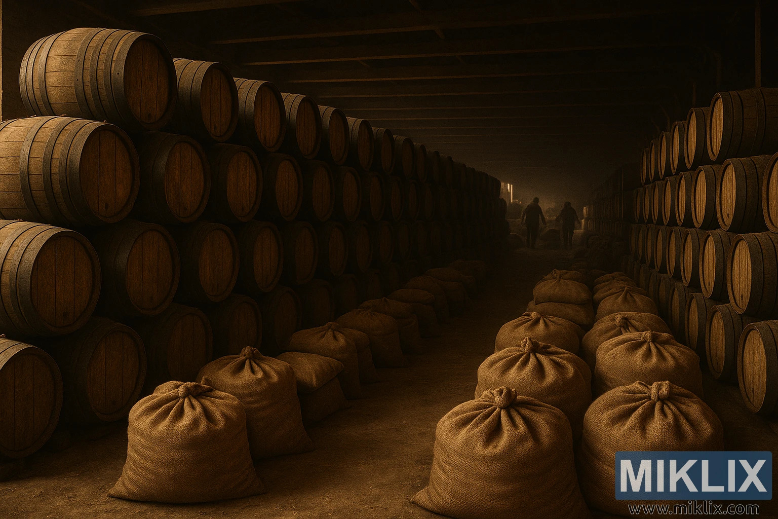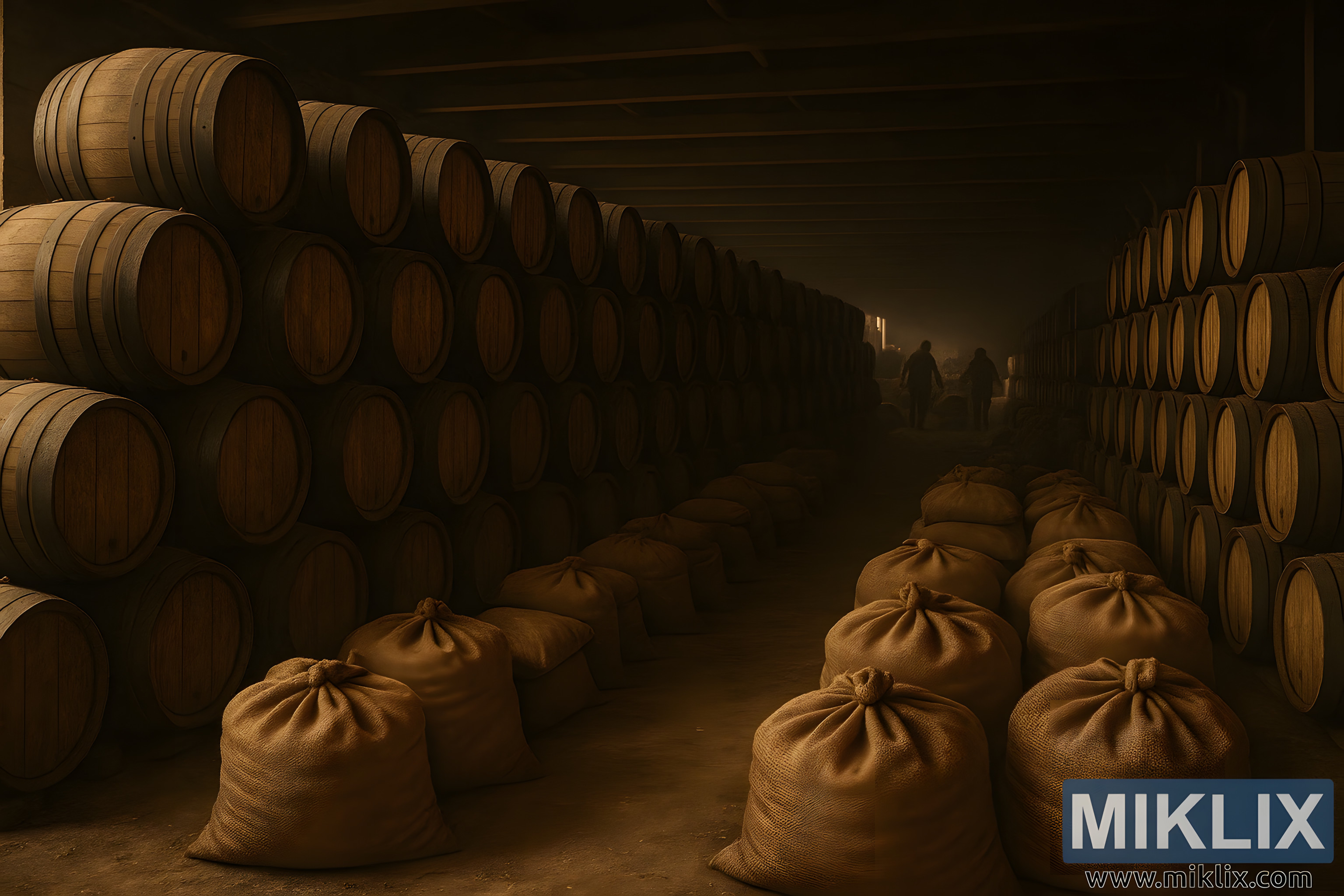 baggrunden bevæger tre silhuetter sig gennem rummet, deres konturer blødgøres af afstand og skygge. De synes at passe tønderne eller inspicere sækkene, deres bevægelser er bevidste og uforhastede. Deres tilstedeværelse tilføjer en menneskelig dimension til scenen og minder beskueren om, at bag enhver stor bryg ligger det stille arbejde fra dem, der forstår processens rytme. Disse er forvaltere af smag, vogtere af tradition, og deres bevægelser antyder en dyb fortrolighed med materialerne og miljøet.