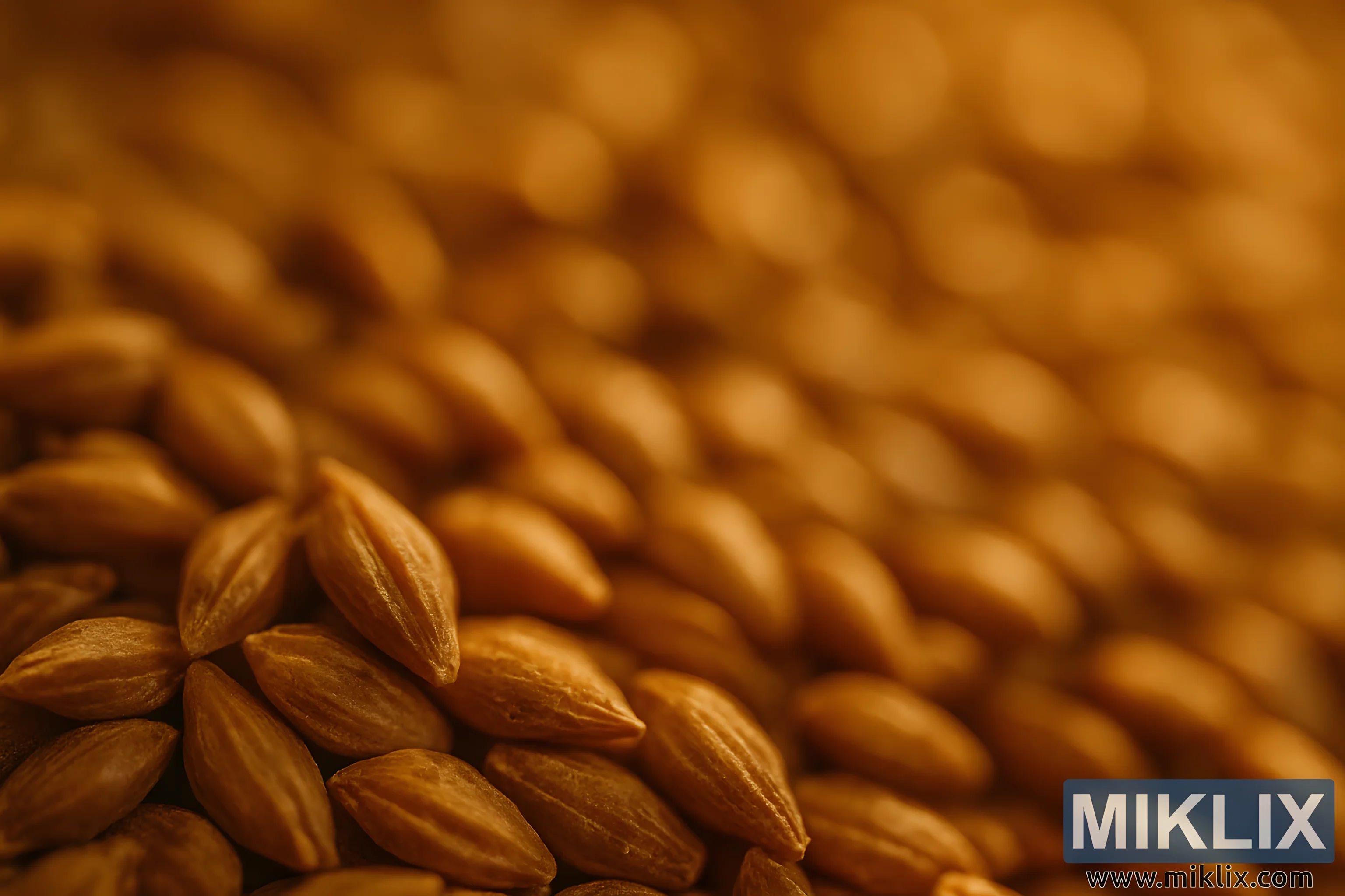 Baggrunden, selvom den er ude af fokus, bidrager til den overordnede atmosfære. Den falmer ind i en blød bokeh af varme toner, der afspejler kornets gyldne palet og forstærker følelsen af naturlig harmoni. Denne sløring er ikke tom – den antyder overflod, tilstedeværelsen af mere malt, der venter på at blive transformeret. Den antyder en større kontekst: et malteri, et bryggeri, et sted, hvor tradition og teknik mødes. Den visuelle blødhed står i kontrast til forgrundens skarphed og skaber en dynamisk spænding, der tilføjer dybde og bevægelse til billedet.