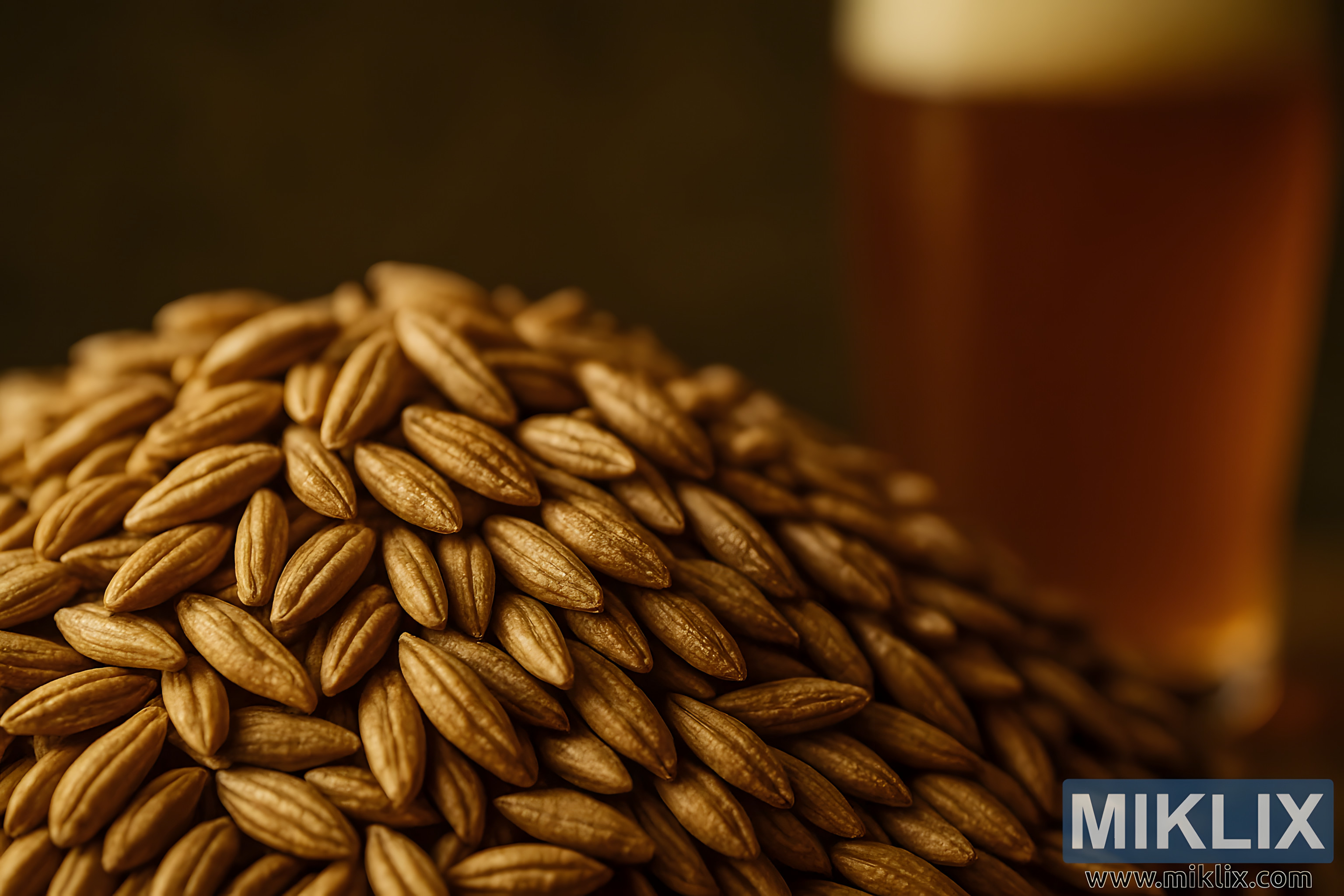Rugmaltkorn med tydelige kamme og varme gyldne nuancer vises i nærbillede, med et sløret ølglas i baggrunden, der antyder deres krydrede smag.