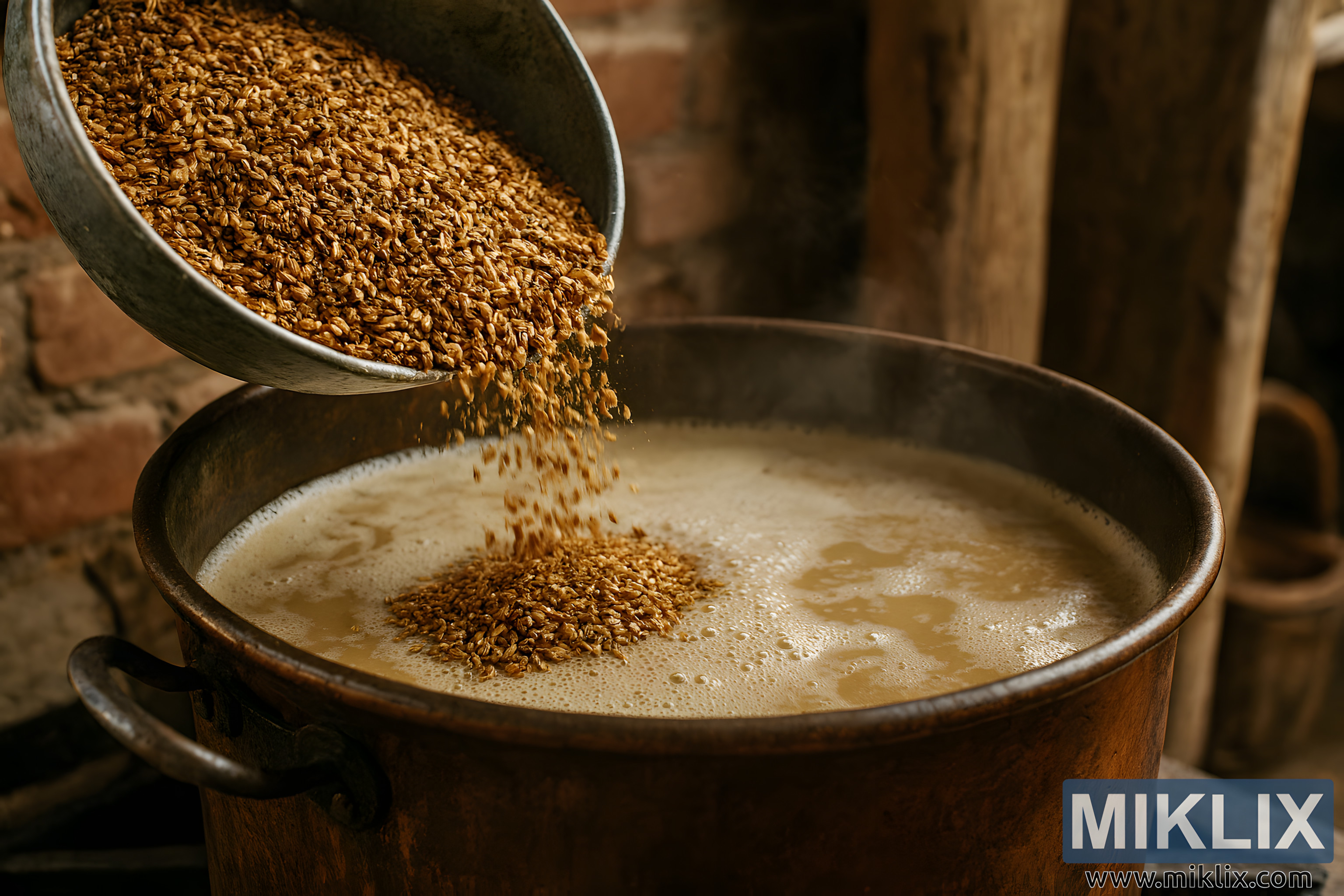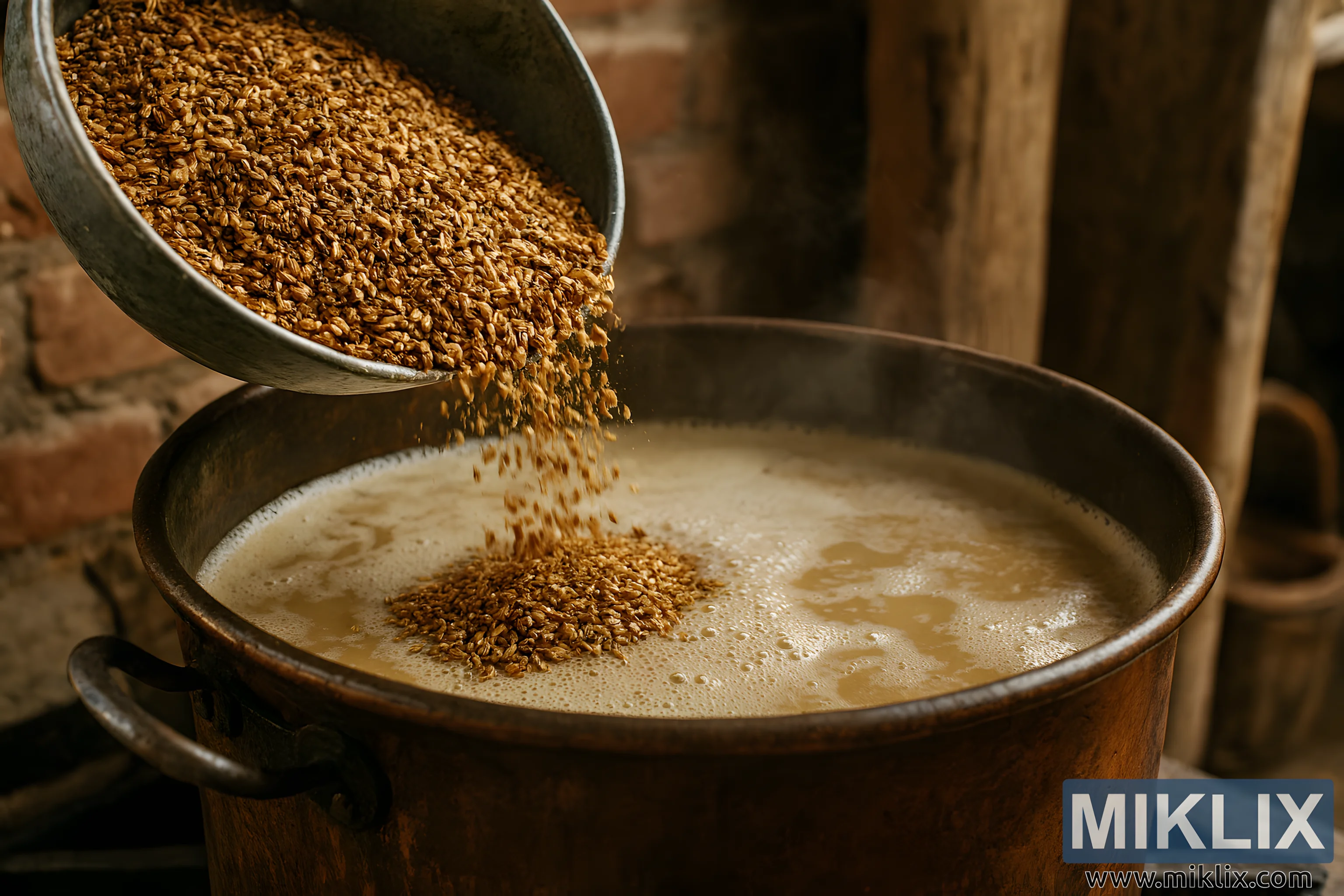 Nærbillede af knust specialristet malt tilsat en skummende mæskegryde i en traditionel hjemmebrygning med varm belysning, kobberkedel og rustik baggrund af mursten og træ.
