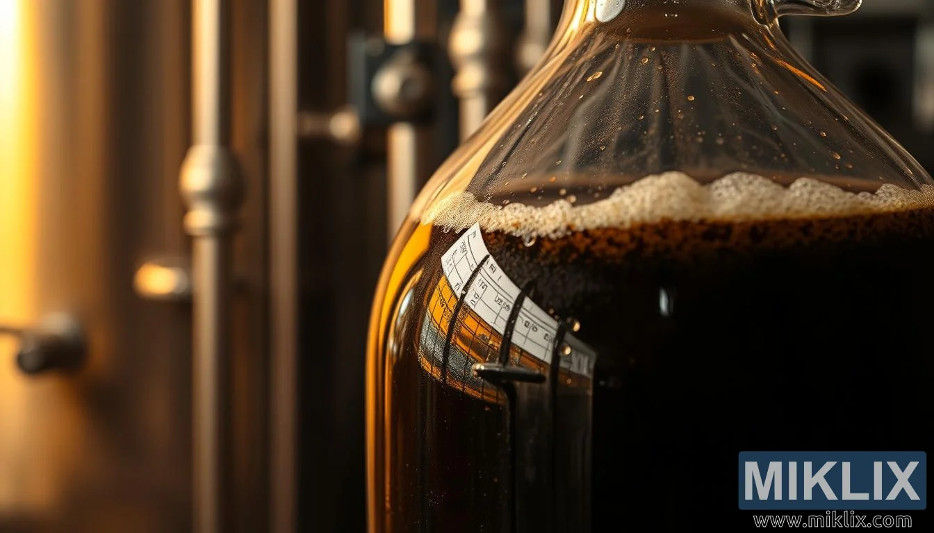 Nærbillede af gæring i en glasdunk med boblende ristet bygvæske, varmt lys og slørede bryggerimiljøer, der fremhæver brygningstransformationen.