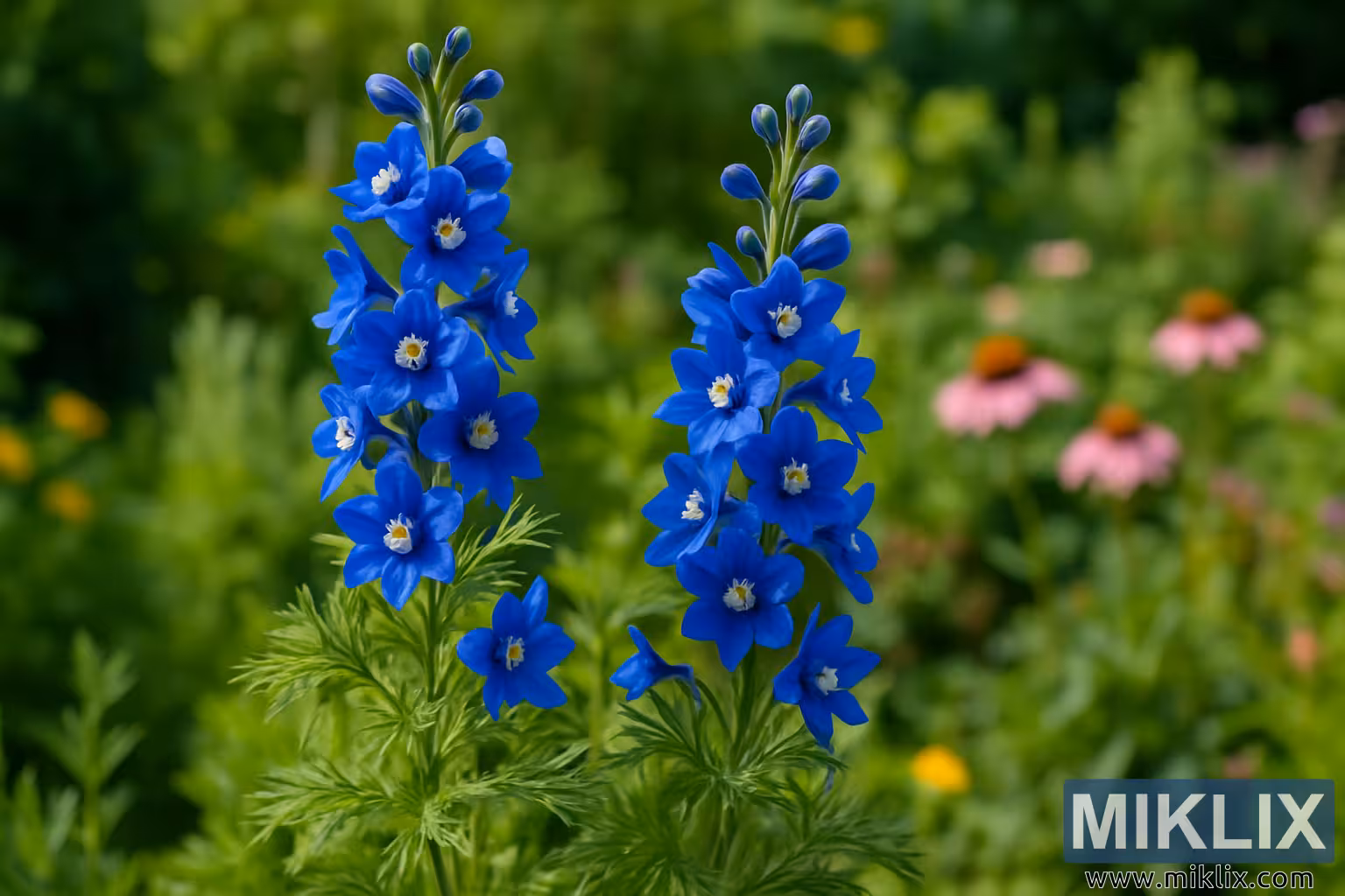 Et højopløsningsfoto af Delphinium 'Blue Butterfly' med livlige koboltblå blomsteraks, hvide bicentre og delikat bregneblad, der skiller sig ud i et frodigt havebed i cottagestil.