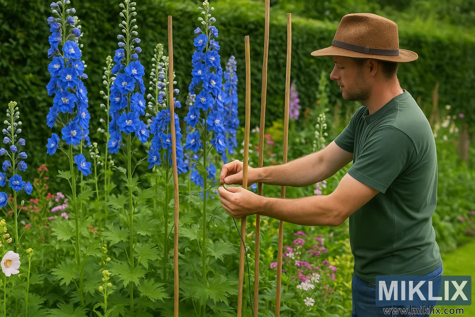 I midten af billedet ses en mand iført en blød brun stråhat, en skovgrøn kortærmet T-shirt og let falmede blå jeans, der omhyggeligt binder en af de høje delphiniumstængler til en slank træpæl. Hans kropsholdning afspejler fokus og omhu – han læner sig let fremad, hænderne stabile og bevidste, og sikrer, at den sarte, men tårnhøje plante er beskyttet mod vind og vejr. Pæleprocessen er en væsentlig del af dyrkningen af delphinium, som er kendt for deres slående lodrette vækst og tunge blomsteraks, der kan nå imponerende højder, men er tilbøjelige til at bøje eller knække uden støtte.