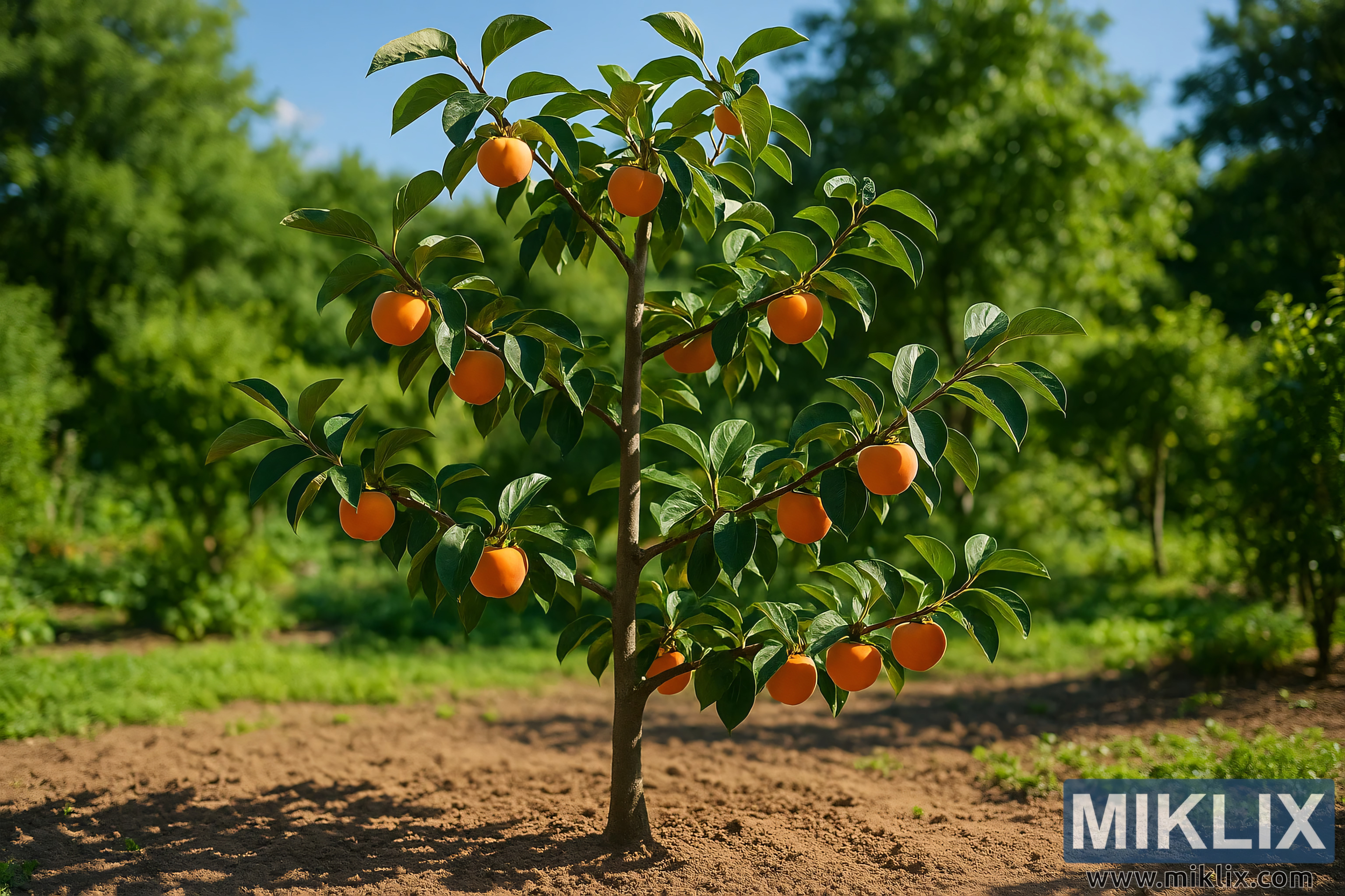 Et livligt persimmontræ trives i solen i en velplejet have, med grene fyldt med orange frugter og rødder forankret i næringsrig, veldrænet jord.
