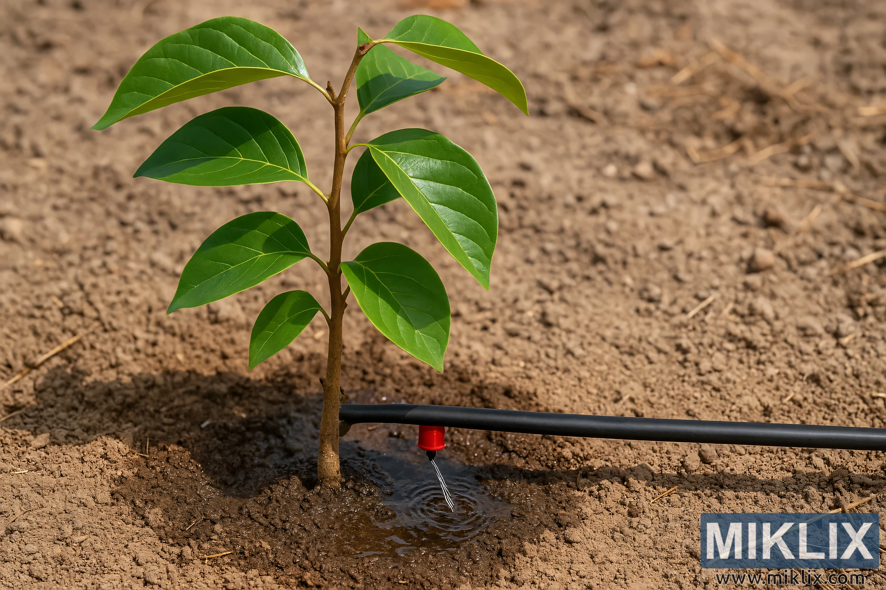 Et nærbillede af et ungt kakitræ, der modtager præcis vanding gennem et drypvandingssystem, hvilket demonstrerer effektiv fugthåndtering for sund rodudvikling under tørre forhold.