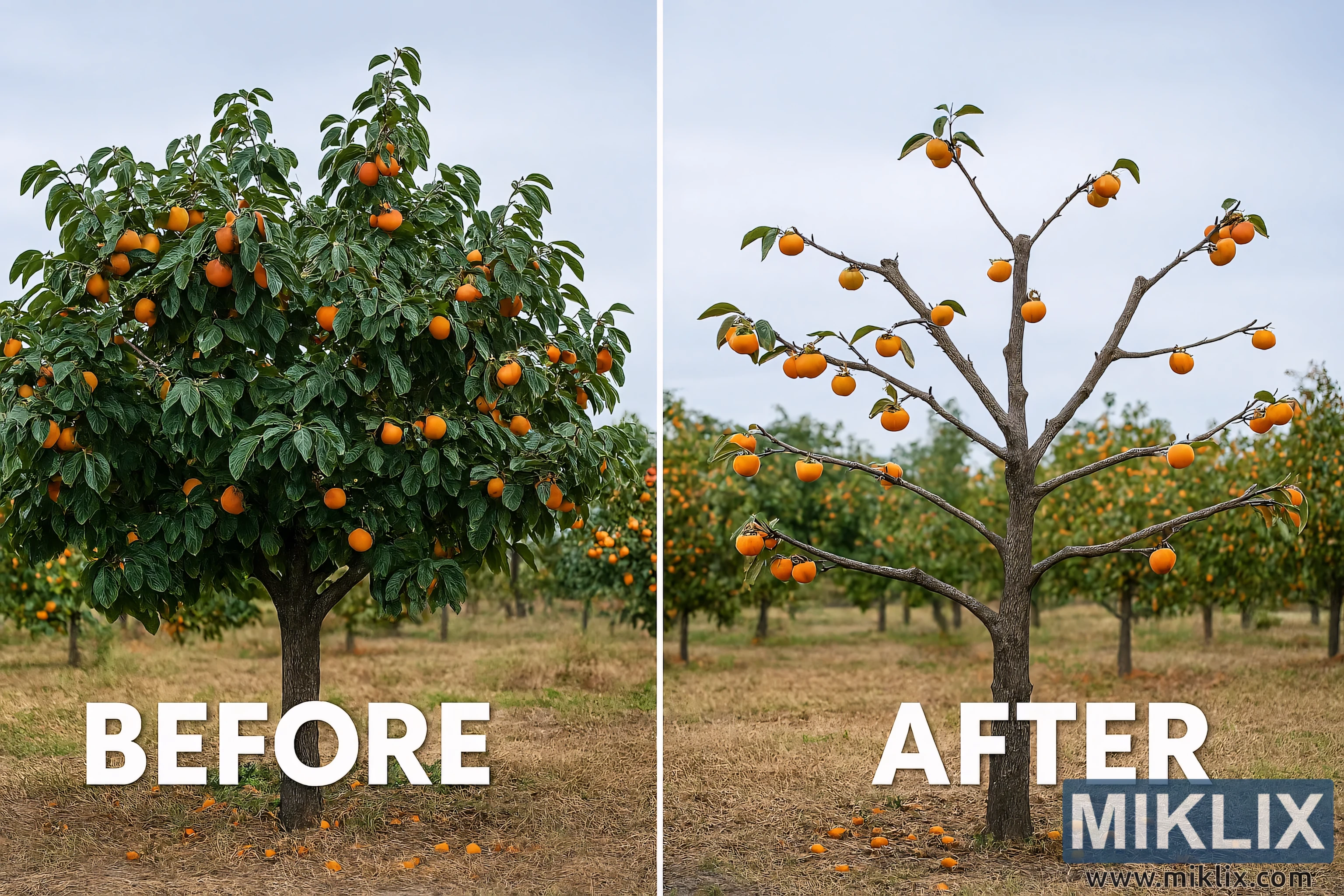 Modsætning hertil viser 'EFTER'-sektionen resultaterne af korrekt beskæring. Træets struktur er nu tydeligt synlig med en central leder og jævnt fordelte sidegrene. Kronen er åben og afbalanceret, hvilket tillader lys og luft at trænge ind gennem løvet. Antallet af blade er reduceret, men de forbliver sunde og livlige. Kakifrugterne er mere jævnt fordelt og lettere tilgængelige, hvilket indikerer forbedret frugtkvalitet og udbytte. Stammen er tydeligt fremhævet, og træets overordnede form er mere symmetrisk og håndterbar. Jorden nedenunder forbliver ens med tørt græs og nedfaldne blade, hvilket opretholder kontinuiteten mellem de to halvdele.