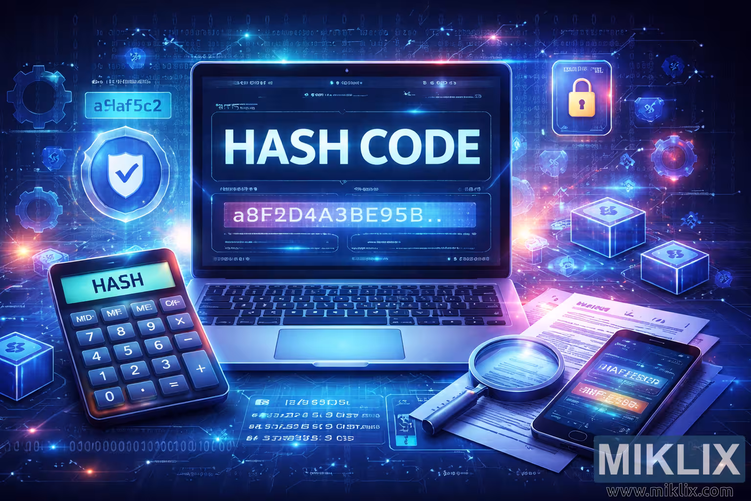 Omkring den bærbare computer er der adskillige komplementære elementer, der forstærker temaet hashing, beregning og digital sikkerhed. I venstre forgrund er en lommeregner vinklet mod beskueren med store, tydeligt definerede knapper og et lille display mærket "HASH", hvilket antyder en specialiseret lommeregner til kryptografiske eller checksum-operationer. Bag den svæver gennemskinnelige grænsefladeelementer i luften, herunder et skjoldikon med et flueben og strømme af binær kode, der symboliserer dataintegritet, verifikation og sikkerhed.