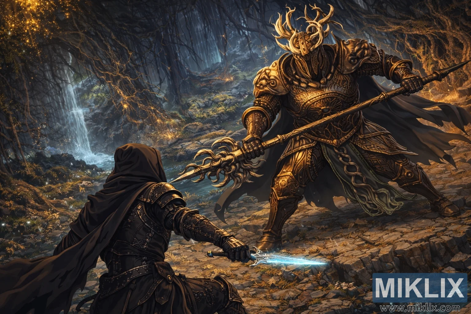 Miljøet fordyber stemningen af frygt og undren. Kolossale rødder buer sig over hovedet og gløder svagt med blå årer, der pulserer som et underjordisk hjerteslag. Et tåget vandfald strømmer ned i en reflekterende pool i baggrunden og spreder lys i drivende partikler, der svæver som fanget stjernelys. Gyldne blade og lysende sporer hvirvler gennem luften, fanget midt i bevægelse, som om tiden er blevet suspenderet i øjeblikket før nedslaget.