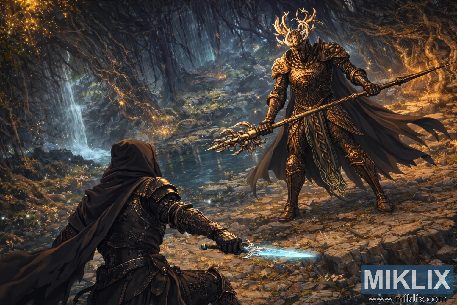 Selve miljøet føles levende og medskyldigt i konfrontationen. Kolossale rødder snor sig over hovedet, ført med svage bioluminescerende årer, der pulserer i blå og gyldne farver. Et tåget vandfald løber ud i en lysende pool i baggrunden og spreder glitrende partikler i luften. Gyldne blade og drivende sporer svæver mellem figurerne, ophængt i et øjeblik, der føles som om tiden er blevet strakt tyndt.