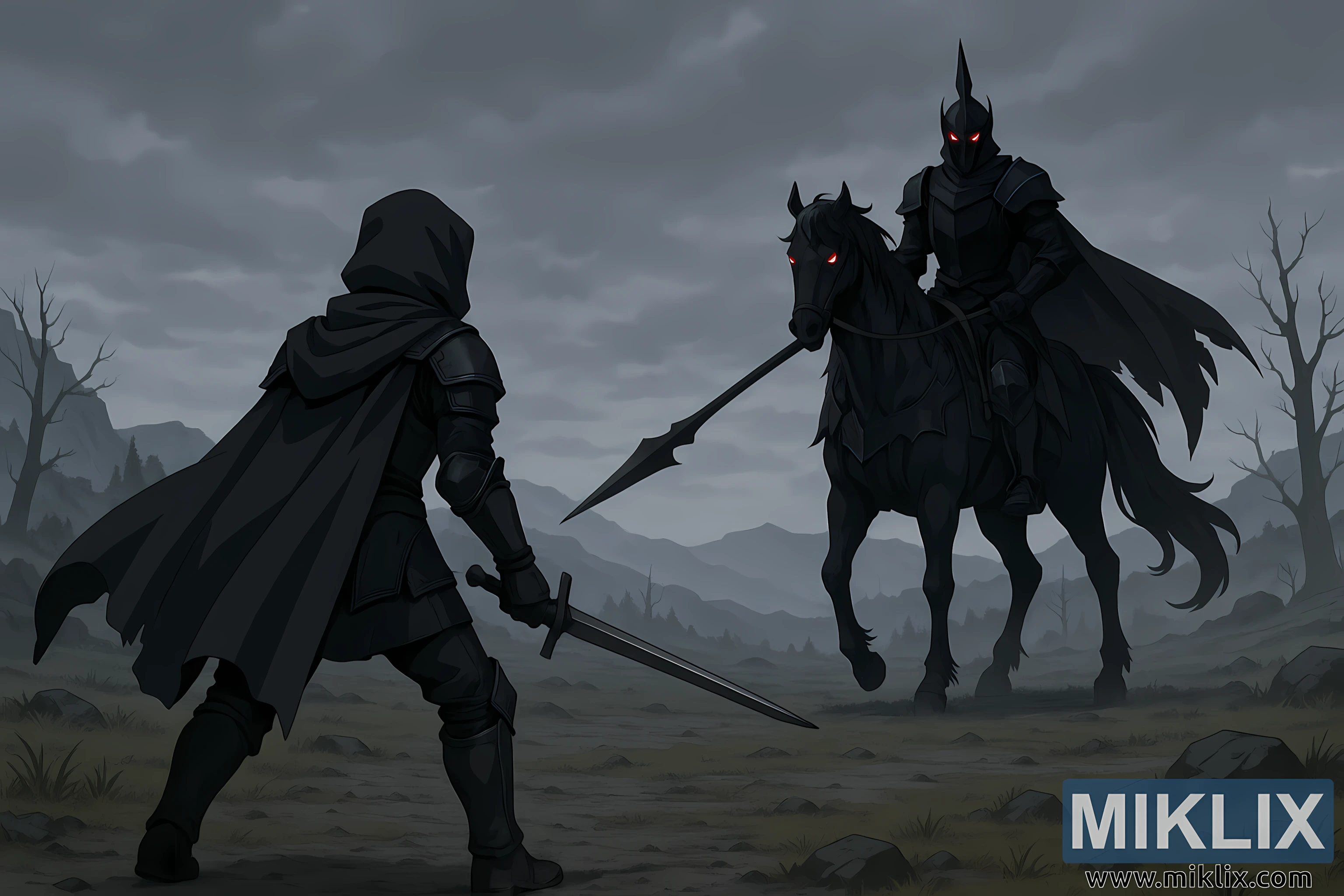 Det fjerne, placeret lige midt i billedet, sidder Nattens Kavaleri oven på sin sorte hest som et fastgjort spøgelse. Ridderens rustning forbliver skarp, kantet og fuldstændig uigennemsigtig og reflekterer intet lys bortset fra det, der glimter svagt langs kanterne. En lang glasur hviler vinklet nedad i hans greb, bladets kurve minder om en rovdyrsklor, der er klar til at angribe. Hesten under ham matcher hans silhuet - høj, muskuløs og bælgmørk bortset fra de glødende røde øjne, der gennemborer tågen som gløder i falmende kul. Rytteren og hesten fremstår sammen statuelignende, ubevægelige, men alligevel vibrerende af potentiel energi, som en bue trukket tilbage til den sidste centimeter før den slippes løs.