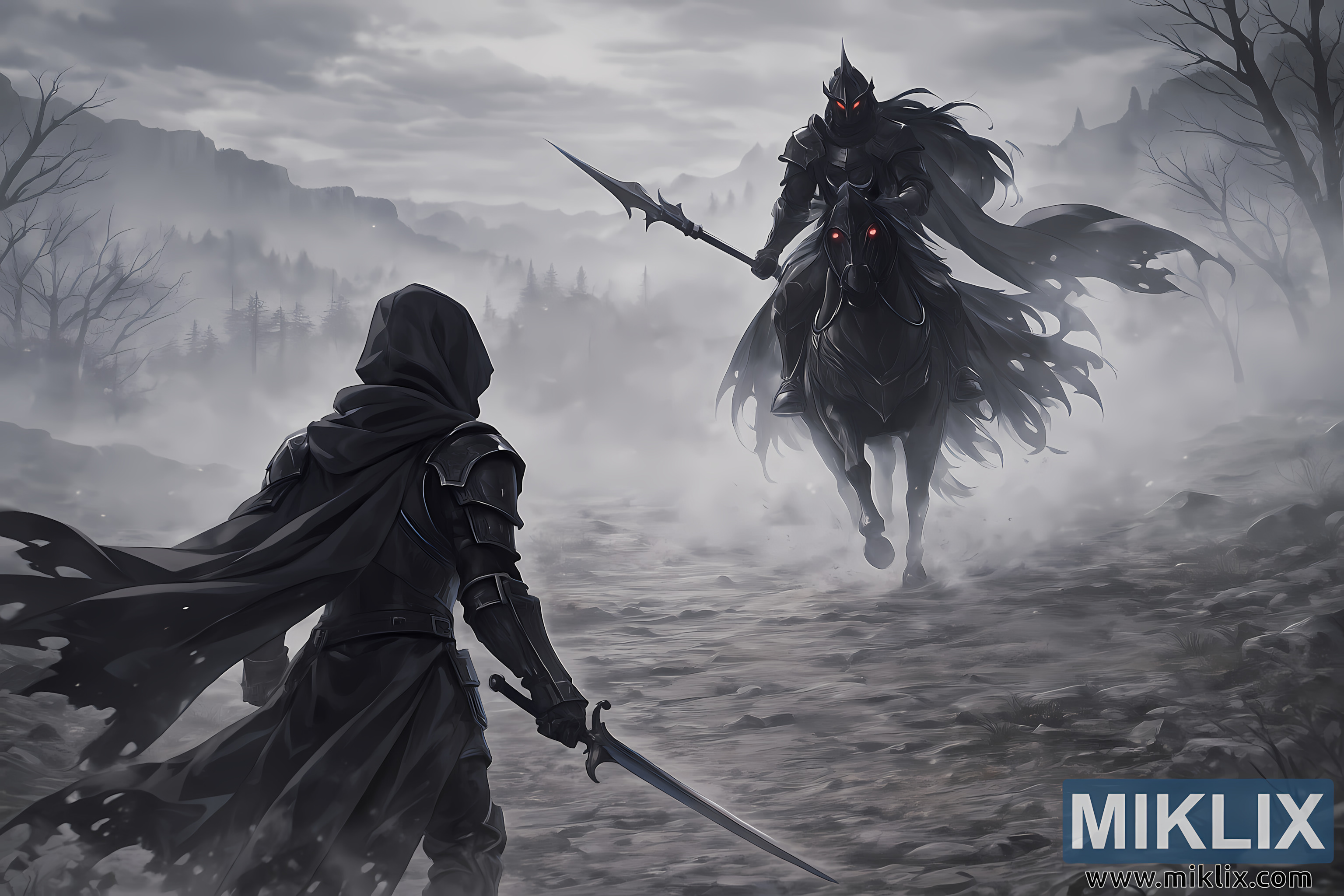 Et fejende, filmisk syn indfanger øjeblikket, hvor et legendarisk møde bliver uundgåeligt. Scenen udfolder sig i et dystert, tågefyldt ødemark, hvor farvepaletten domineres af kolde grå og dæmpede sorte nuancer. Lave bjerge og en fjern skov spænder langs horisonten, men de opsluges næsten fuldstændigt af rullende tågegardiner. Nøgne træer rejser sig som snoede silhuetter på begge sider af kompositionen, deres grene strækker sig ud som skeletlignende hænder. Jorden under fødderne er ru og ujævn, en blanding af revnede sten, spredte klipper og pletter af tørt, livløst græs, som om selve landet for længst har opgivet håbet.