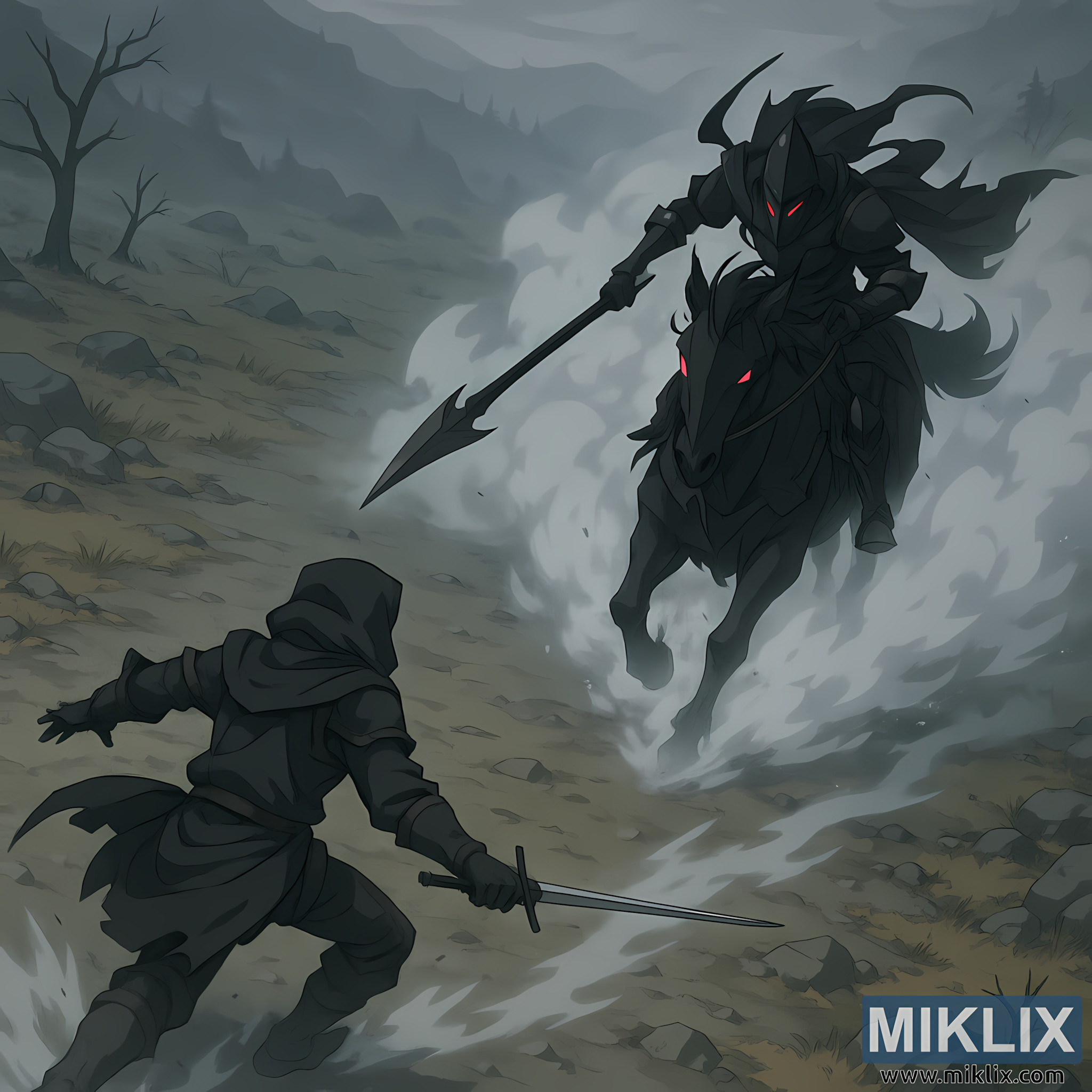 Rytteren, rustet i en takket mørk plade, læner sig frem i sadlen for at drive angrebet. Hans design er kantet og imponerende med skarpe panser og en hjelm, der smaller ind i en spids kam. Den delvise vinkel over hovedet lader os se både oversiden af hans rustning og forsiden af hans hjelm, hvorfra to røde lysspalter stirrer ned på de Anløbne. En iturevet sort kappe strømmer bag ham, dens kanter flossede og fragmenterede, og blander sig med de hvirvlende tågeskyer og skaber en illusion af skyggefulde vinger, der folder sig ud.