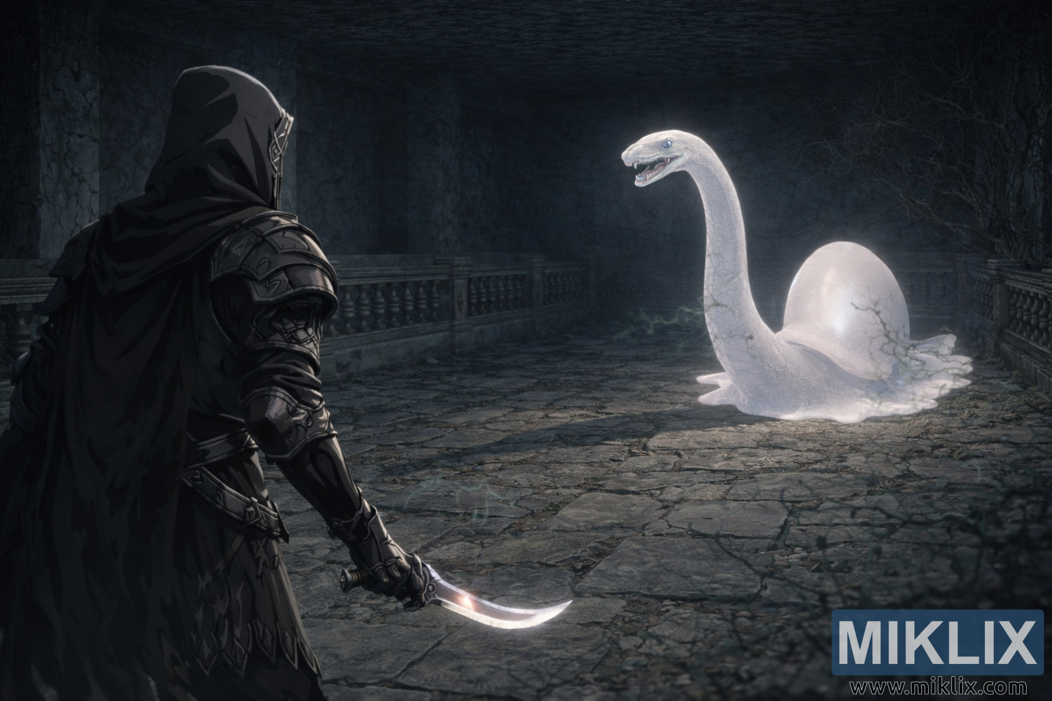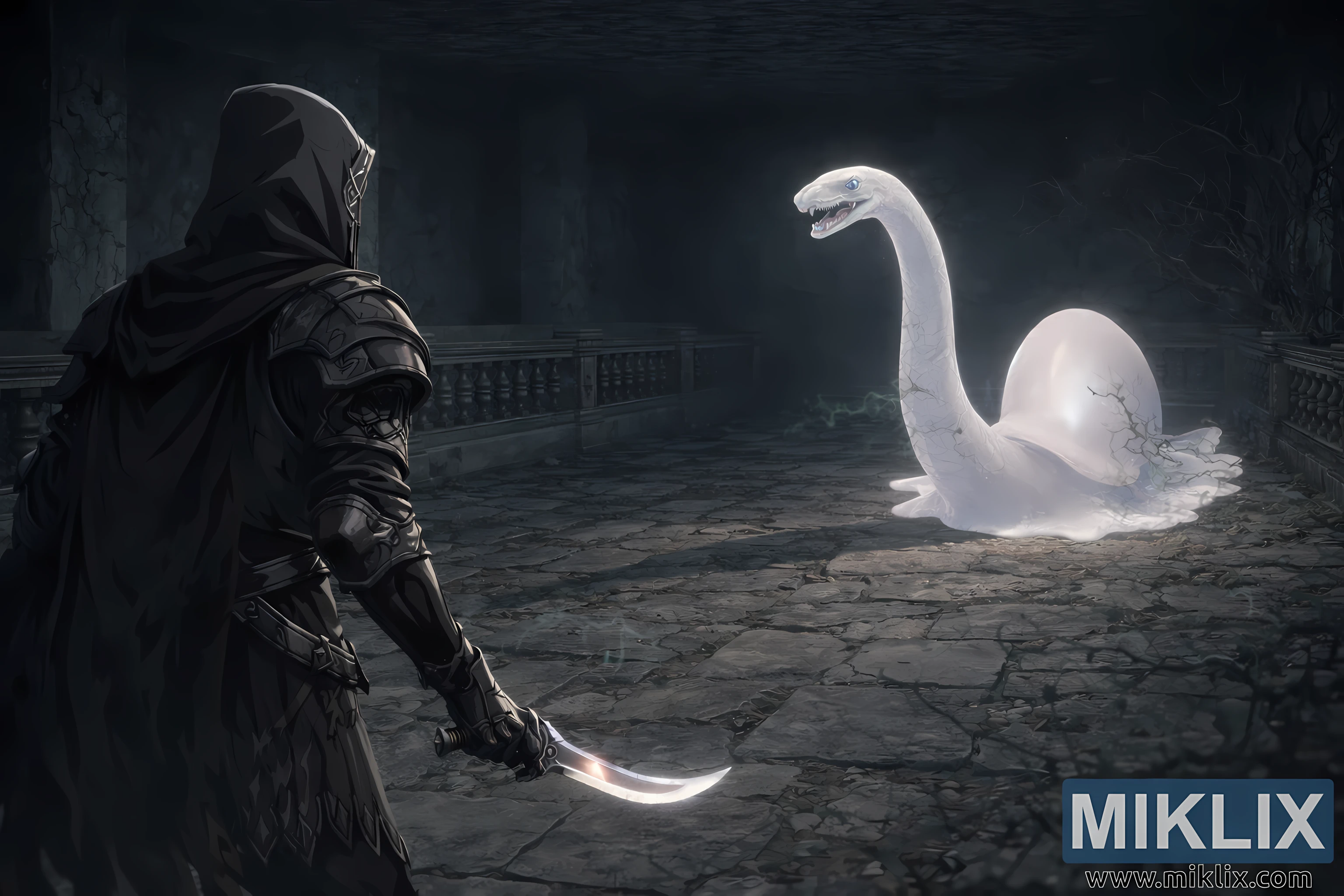 Spiritcaller-sneglen, kendt i spillet for sin evne til at tilkalde magtfulde åndekrigere, dukker op midt i en besværgelse, og dens krop udstråler et blødt, blåligt lys, der står i skarp kontrast til det omgivende mørke. Spændingen mellem de to figurer er håndgribelig: snigmorderen, jordnær og klar til at angribe, versus sneglen, æterisk og overjordisk, der kommanderer kræfter hinsides sløret.