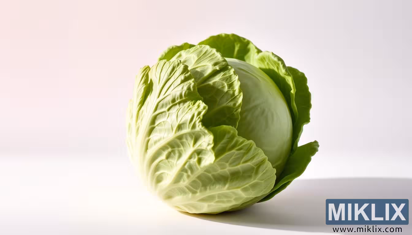 Billedet viser et enkelt, perfekt formet kålhoved, præsenteret med en klarhed og enkelhed, der løfter denne hverdagsgrøntsag til et emne af skønhed og ærbødighed. Dens livlige grønne blade folder sig ud med subtile kurver og årer og indfanger lyset på en måde, der understreger deres naturlige glans og sprøde friskhed. De ydre blade bøjer beskyttende udad og afslører de tætpakkede, lysere indre lag, der danner kålens tætte, afrundede hjerte. Denne kontrast mellem de åbne, mørkere blade og det kompakte, lysere indre tilføjer dybde og dimensionalitet til kompositionen og minder beskueren om både dens skrøbelighed og modstandsdygtighed. Bladenes overflade glimter blødt og antyder fugt og vitalitet, som om kålen lige er blevet høstet og fyldt med liv og energi.