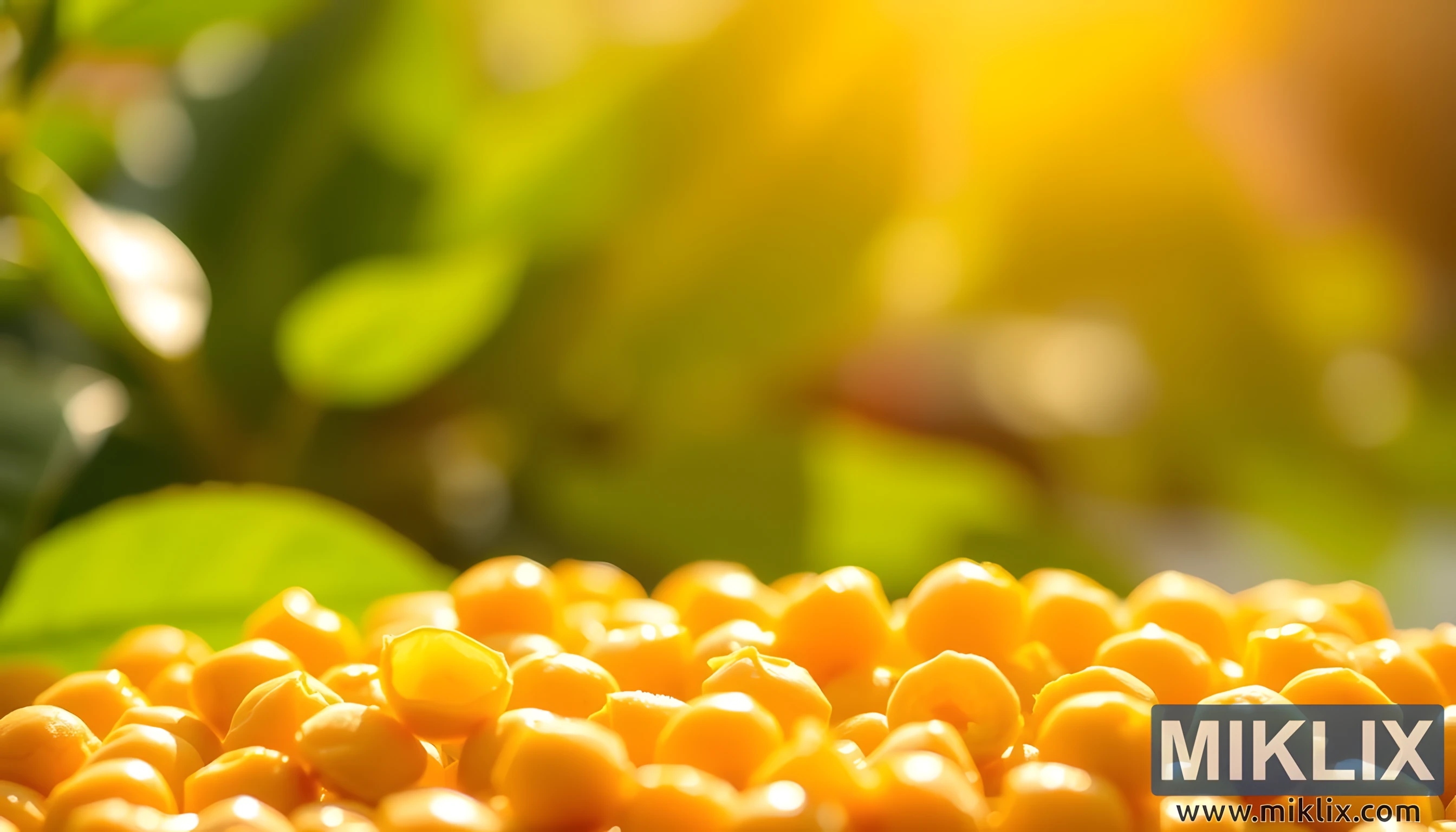 Bag denne glødende forgrund overgår baggrunden til et blødt, sløret lærred af frodigt grønt løv. Bladene, omend utydelige, danner en organisk baggrund, der placerer kikærterne i en kontekst af vækst og natur og diskret minder beskueren om deres plantebaserede oprindelse. Samspillet mellem skarpe detaljer i forgrunden og det drømmeagtige, uskarpe grønne landskab bagved skaber en følelse af harmoni, der bygger bro mellem den dyrkede høst og det frodige miljø, hvorfra disse bælgfrugter opstår. Sollyset, der filtrerer gennem bladene, skaber en glorielignende effekt, der giver hele billedet en følelse af velvære og vitalitet.
