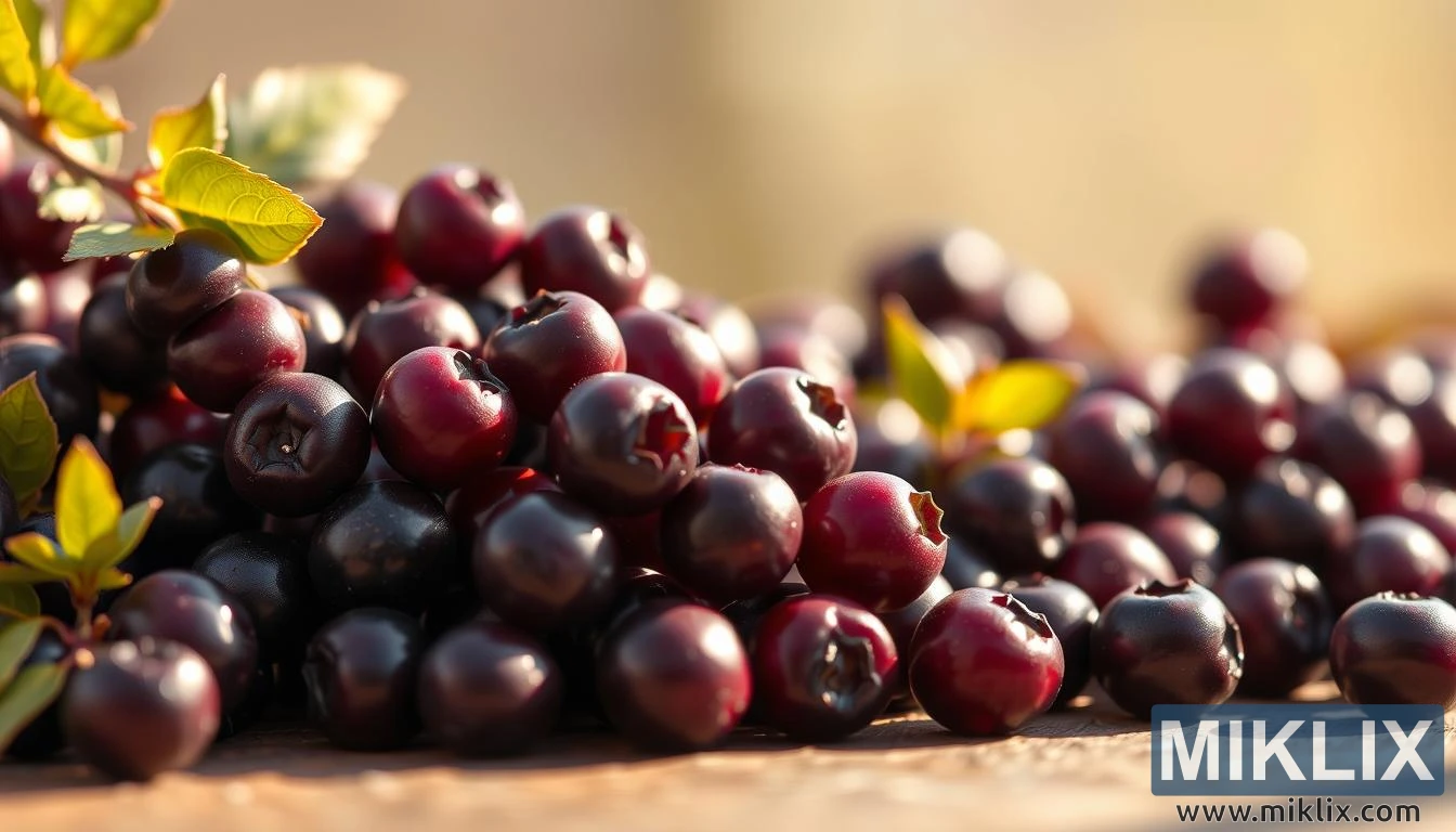 Nærbillede af friske aronia-aroniabær i varmt naturligt lys, der fremviser deres dybe lilla farvetone, blanke tekstur og immunstyrkende fordele.