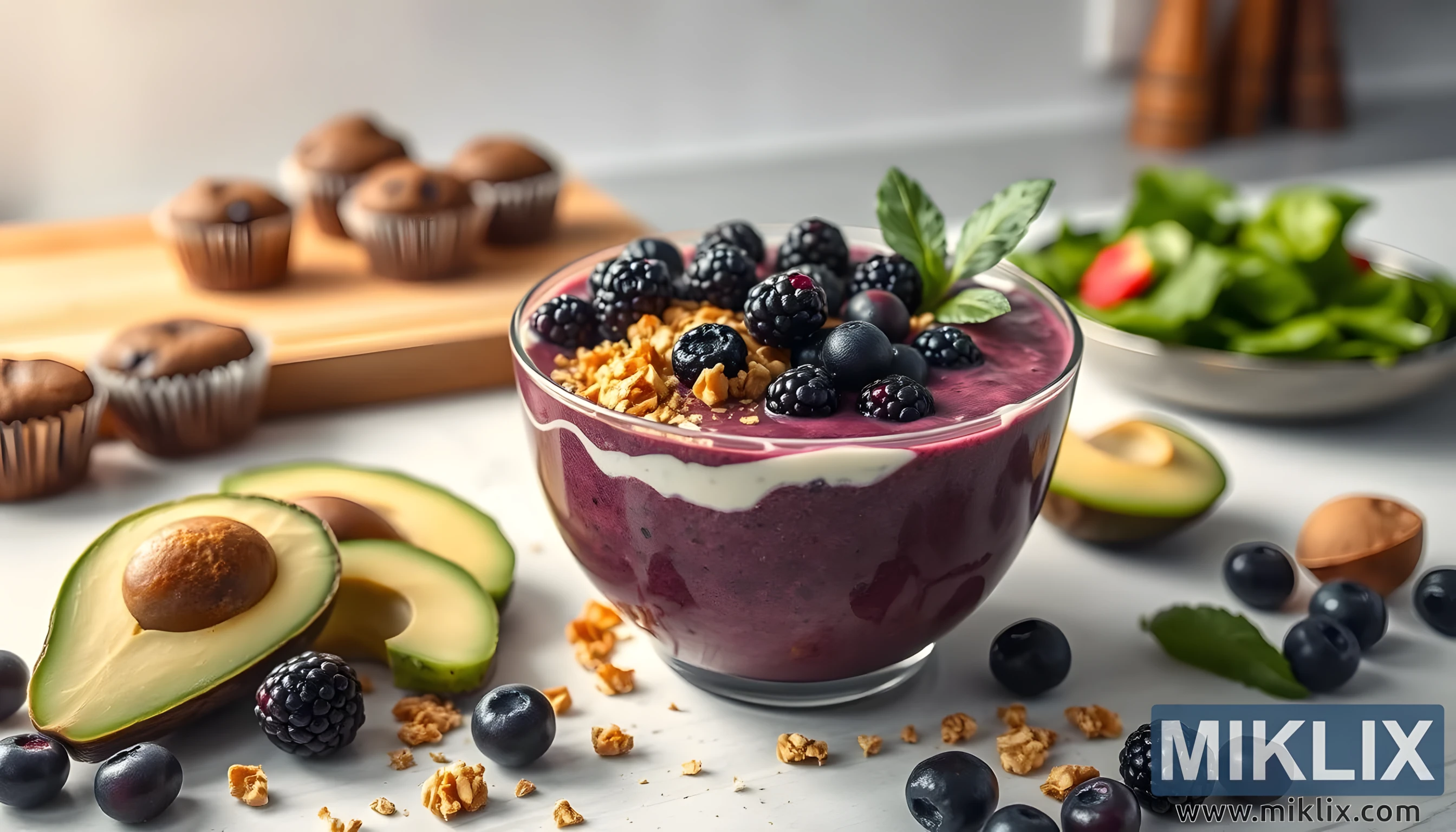 Omkring skålen udvides scenen til et portræt af en afbalanceret og sund livsstil. På den hvide køkkenbordplade bryder spredte granolastykker, skinnende brombær og fyldige aroniabær billedets pænhed med et organisk præg, hvilket antyder en atmosfære af overflod snarere end rigiditet. Til venstre er en moden avocado skåret op, hvis smøragtige frugtkød gløder mod det mørkebrune kerner i midten. Dens tilstedeværelse er ikke kun visuel, men også symbolsk og forstærker temaet om næringsrige superfoods og sunde fedtstoffer, der komplementerer bærenes antioxidante kraft. I baggrunden, let sløret, men stadig tydeligt genkendelig, ligger et skærebræt med en række friskbagte chokolademuffins beriget med aronia, hvis afrundede toppe gløder blødt under det diffuse lys. Sammenstillingen af muffins med smoothie-bowlen understreger aroniabærrenes alsidighed og demonstrerer, hvordan de kan forbedre både lækre godbidder og dybt nærende måltider.