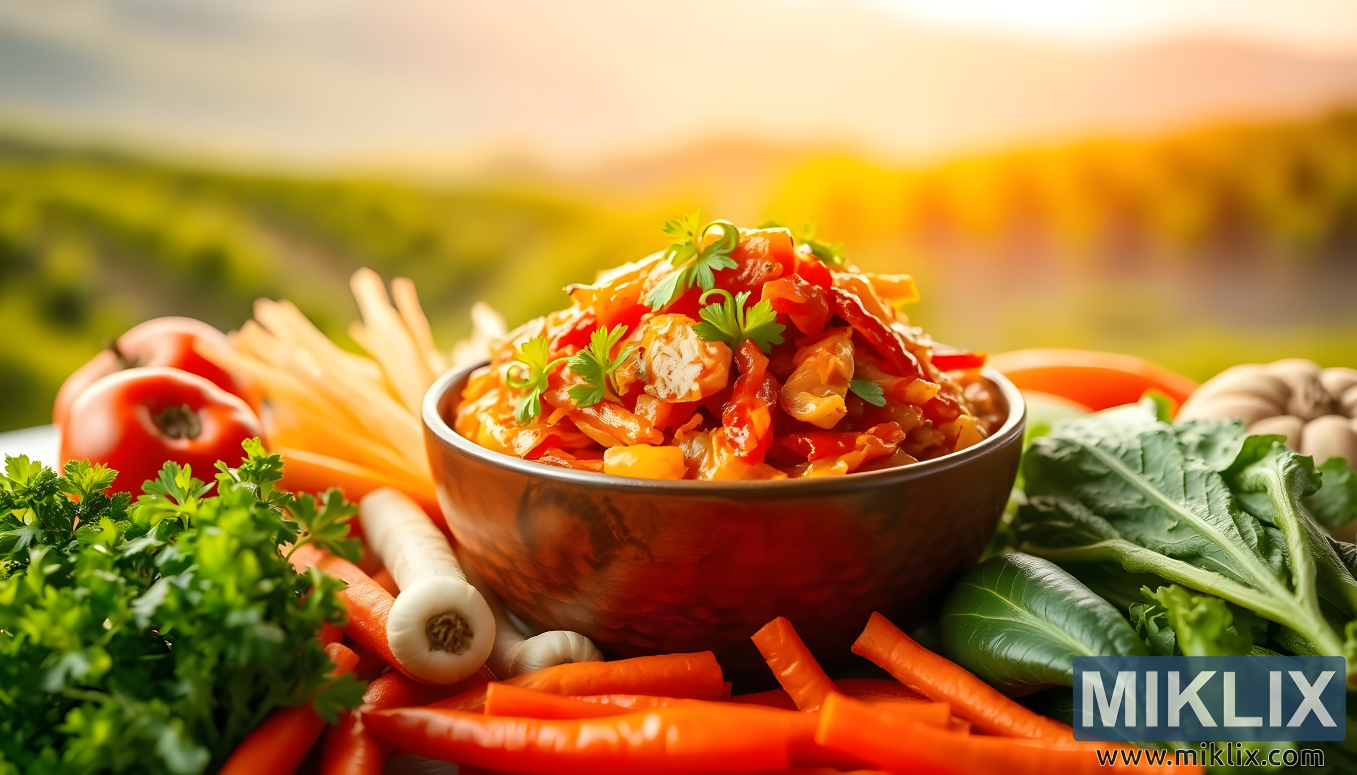 Belysningen i billedet spiller en afgørende rolle i at løfte hele scenen. Varme, gyldne stråler fejer hen over arrangementet og giver genlyd af gløden fra en sen eftermiddagssol, der strækker sig over horisonten. Dette lys forstærker kimchiens mættede farver, hvilket gør de røde nuancer mere brændende, de grønne nuancer mere levende og de orange nuancer mere indbydende. Skygger falder blødt bag ingredienserne og skaber dybde og en følelse af harmoni, mens den naturlige lysstyrke giver en næsten festlig stemning. Det er, som om retten ikke bare er mad, men en kilde til liv og glæde, fyldt med selve naturens varme. Baggrunden, blødt sløret, men stadig umiskendeligt frodig med bølgende grønne marker, forstærker det intime forhold mellem maden og jorden. Det antyder, at kimchiens smagsoplevelser og sundhedsfremmende egenskaber ikke er isolerede fænomener, men direkte gaver fra frugtbar jord, solskin og omhyggelig dyrkning.