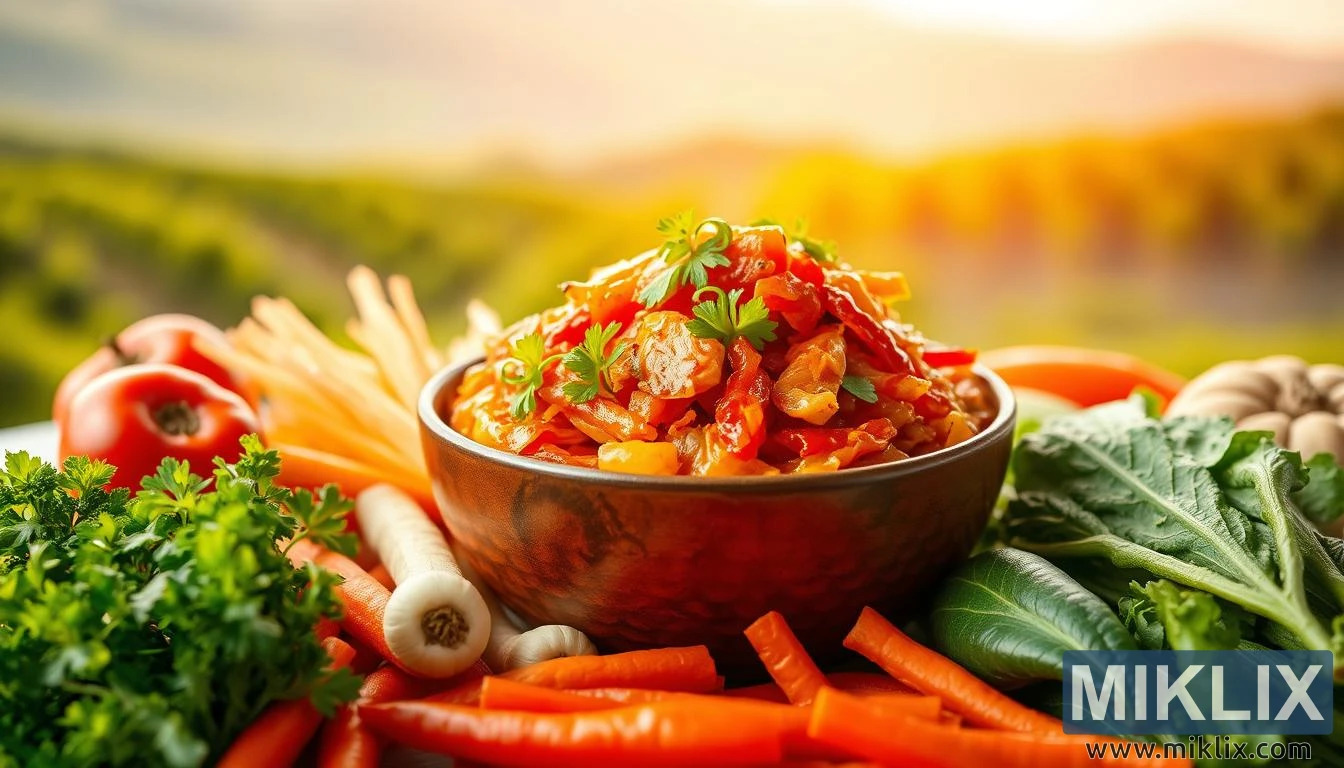 En livlig skål kimchi med friske grøntsager, der gløder i naturligt lys og symboliserer dens næringsværdi og sundhedsfremmende egenskaber.