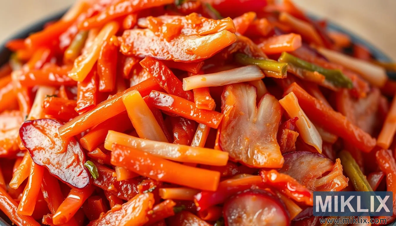 Et detaljeret nærbillede af hjemmelavet kimchi, der fremhæver dens levende farver, teksturer og de ernæringsmæssige fordele ved denne traditionelle koreanske superfood.