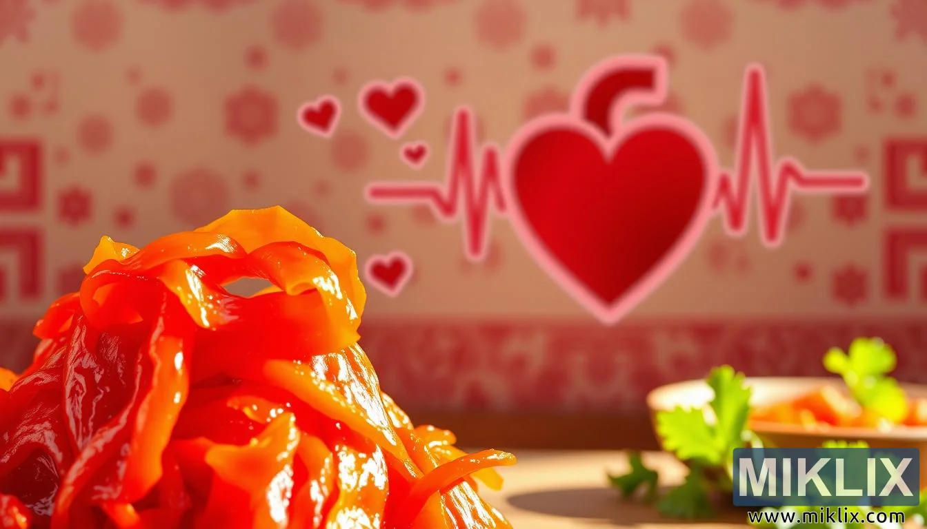Billedet tilbyder en levende og symbolsk skildring af kimchi, der forbinder den elskede koreanske ret med det bredere tema om hjerte-kar-sundhed på en visuelt engagerende og meningsfuld måde. Forrest ligger en bunke kimchi, hvis blanke, rødlige tråde fanger det varme lys. De fermenterede grøntsager glimter, chilipastaen hænger fast i hver fold og kurve på kålen, mens fine skiver og strimler stables naturligt og danner en dynamisk bunke, der virker levende med energi. Teksturen er slående, både sprød og smidig, og antyder friskhed, samtidig med at den minder beskueren om fermenteringsprocessen, der beriger retten med probiotika og næringsstoffer. De intense røde og orange farver fremkalder vitalitet og varme, hvilket visuelt forstærker kimchis ry som en fødevare, der styrker både krop og sjæl.