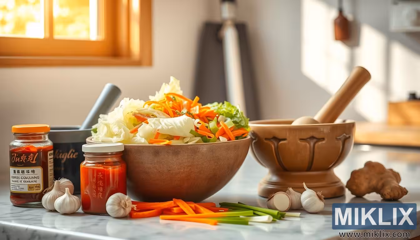 En varm køkkenscene med kinesiske kinakål, gulerødder og krydderier arrangeret til at lave hjemmelavet kimchi, der fremhæver dens sundhedsmæssige fordele og tradition.