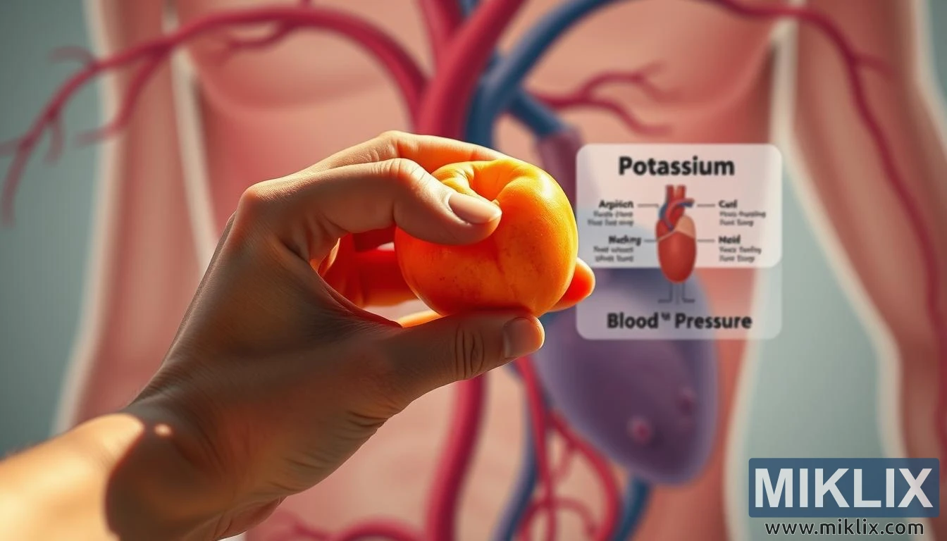 Nærbillede af en hånd, der holder en kaliumrig abrikos med blodkar og et medicinsk diagram i baggrunden, der fremhæver dens rolle i reguleringen af blodtrykket.