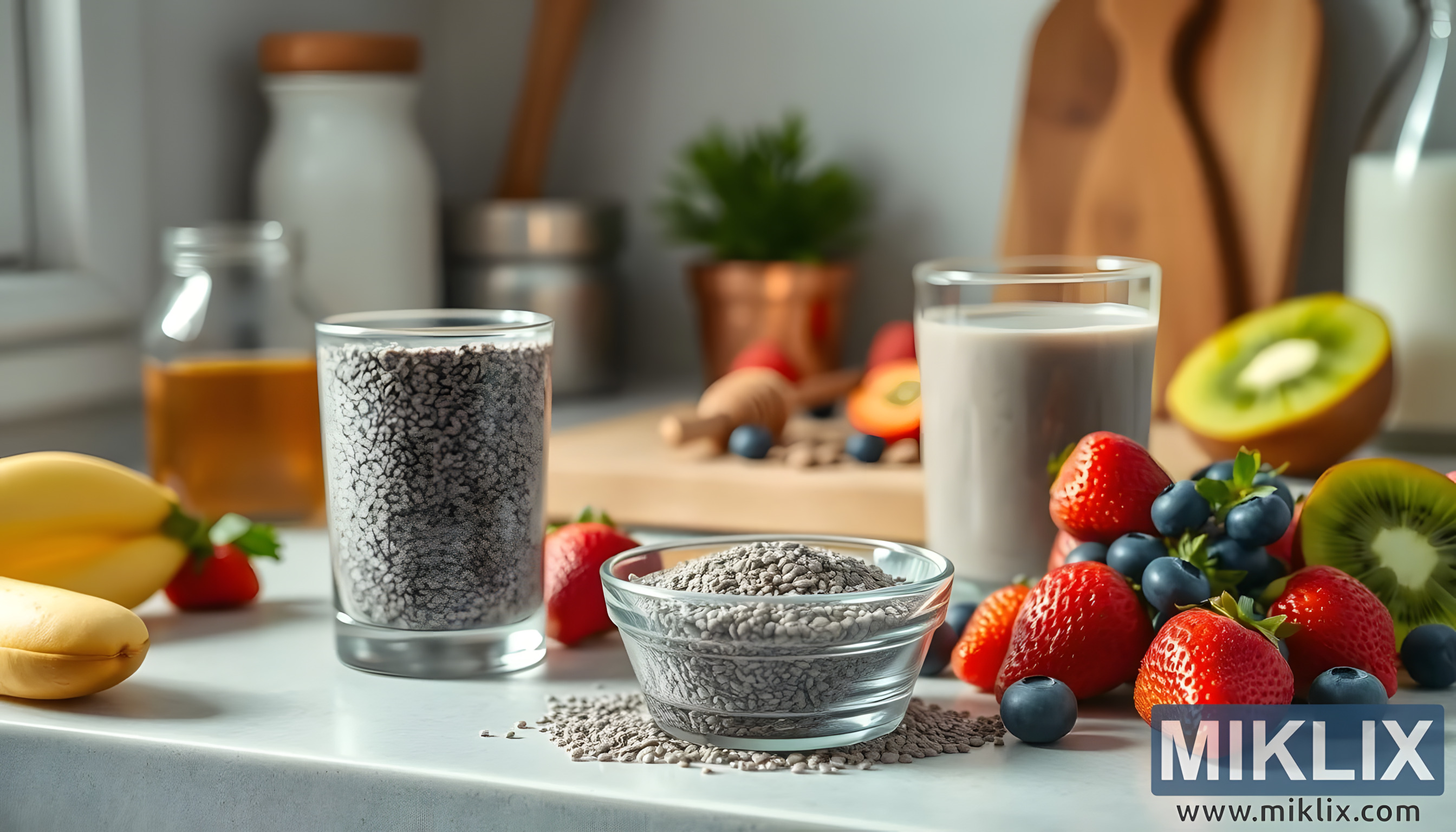 Køkkenbord med chiafrø, frugter, budding og mandelmælk under blødt lys, der fremviser chiafrøenes alsidighed i en sund og afbalanceret kost.