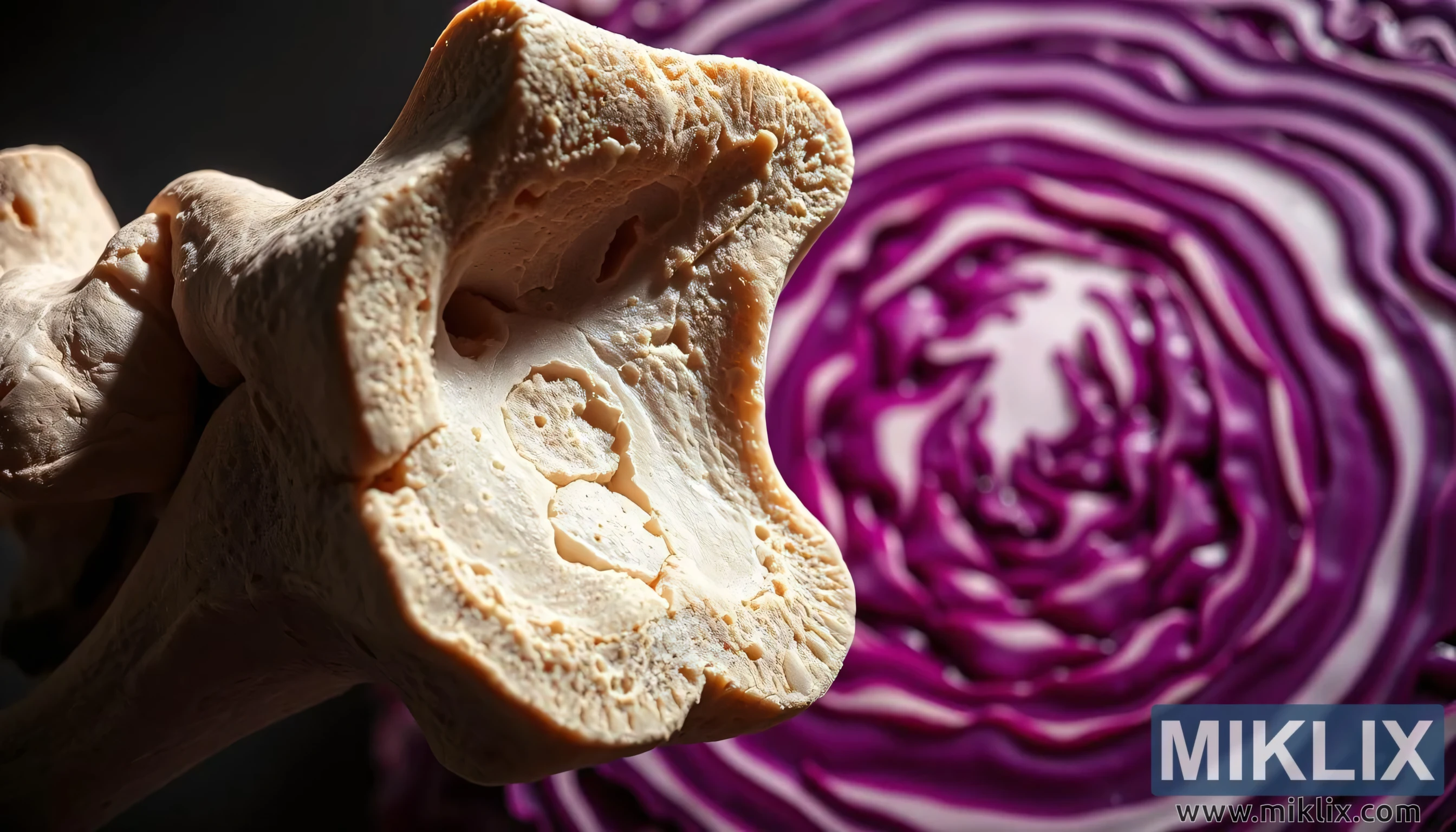 Billedet præsenterer en slående og tankevækkende sammenstilling af naturlige former, der bringer det indviklede tværsnit af en menneskeknogle sammen med de levende, koncentriske spiraler af et rødkål. I forgrunden fremstår knoglen monumental, forstørret for at afsløre de bemærkelsesværdige detaljer i dens indre struktur. Dens porøse, svampelignende netværk eksponeres med næsten skulpturel klarhed, hvor den trabekulære ramme minder om både styrke og skrøbelighed på én gang. Blød, retningsbestemt belysning fremhæver dens teksturer, med skygger, der samler sig i de dybere hulrum og fremhæver den komplekse geometri, der understøtter dens holdbarhed. Overfladen virker taktil, dens ruhed antyder modstandsdygtighed, samtidig med at den fremkalder sårbarhed, en påmindelse om den fine balance, knogler skal opretholde mellem tæthed og fleksibilitet for at understøtte menneskekroppen gennem et helt liv.