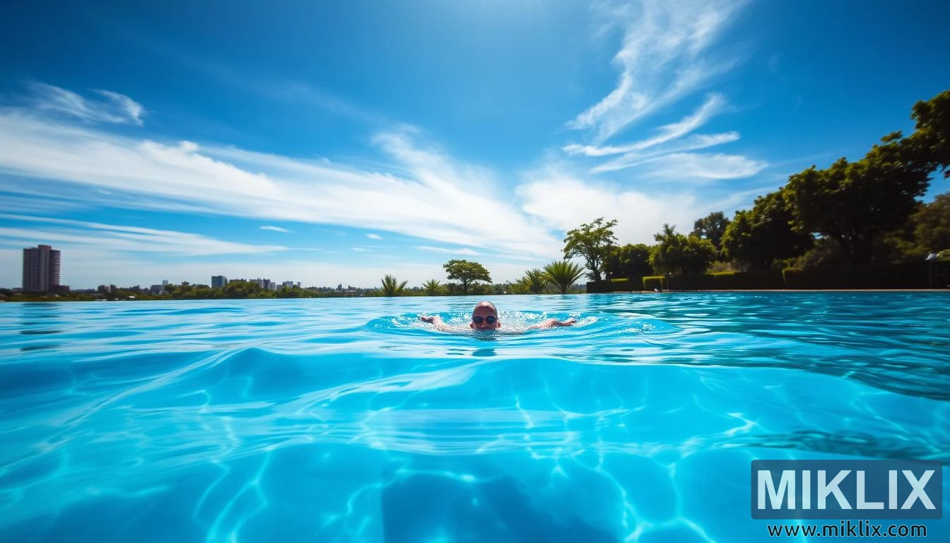Person svømmer brystsvømning i en klar blå pool med frodigt grønt, byens skyline og en livlig himmel, der fremkalder en rolig, sommerlig atmosfære.