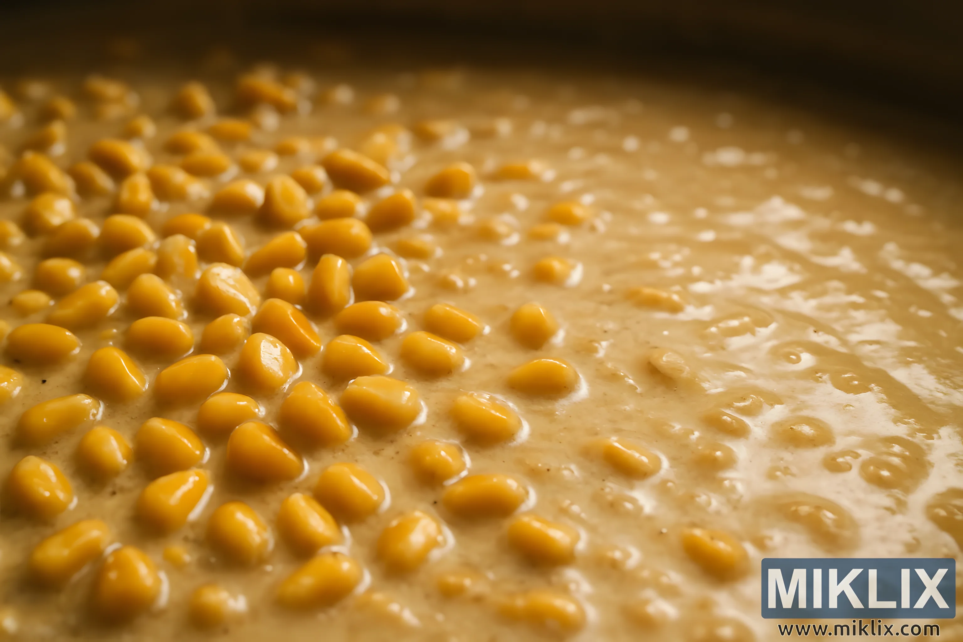 Nahaufnahme von goldenen Maiskörnern, die in cremigem Gerstenbrei verstreut sind, warm beleuchtet, um Texturen und Farbtöne hervorzuheben und an die handwerkliche Brautradition und das Handwerk zu erinnern.