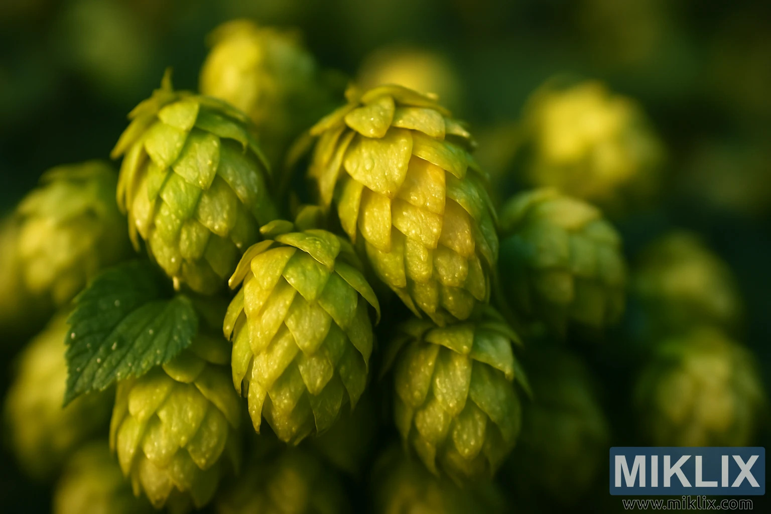 Der Vordergrund ist scharf fokussiert und ermöglicht die Erkundung bemerkenswerter Details der Pflanze: die spiralförmige Anordnung jedes schuppenartigen Hochblatts, die subtile Farbabstufung von tiefem Grün an der Basis bis zu helleren, gelbgrünen Spitzen und die organische, geschichtete Geometrie, die die charakteristische Zapfenform des Hopfens definiert. Die Zapfen stehen dicht beieinander und strahlen Fülle und Vitalität aus. Ein einzelnes Hopfenblatt mit sichtbarer Aderung und kleinen Taupunkten an den Rändern ragt aus der Traube hervor und bietet einen Kontrast zu den runden Zapfen und sorgt für eine subtile Variation in Form und Gestalt.